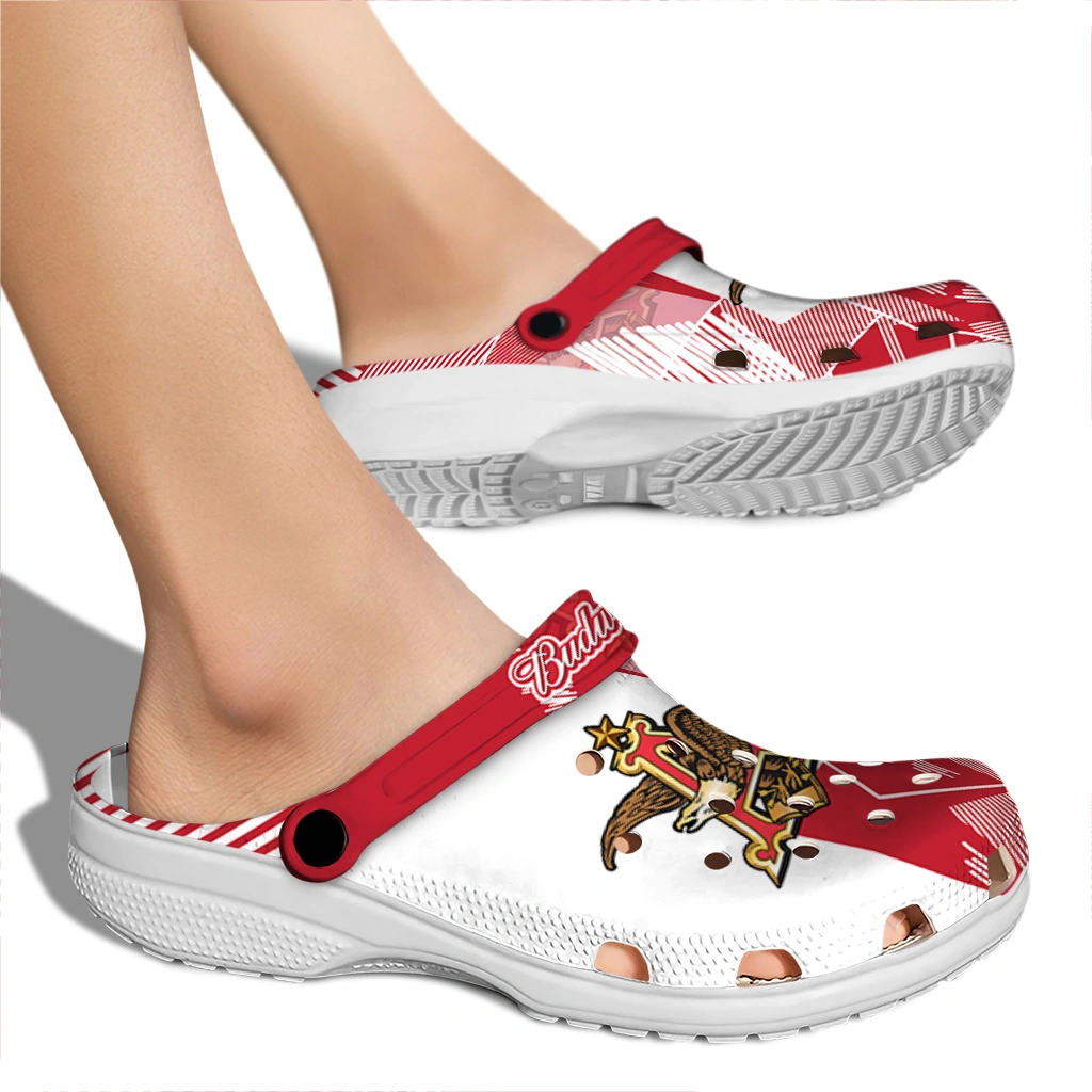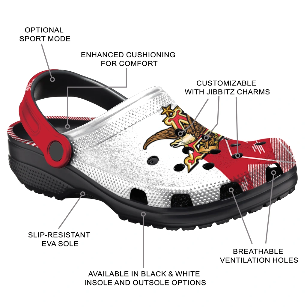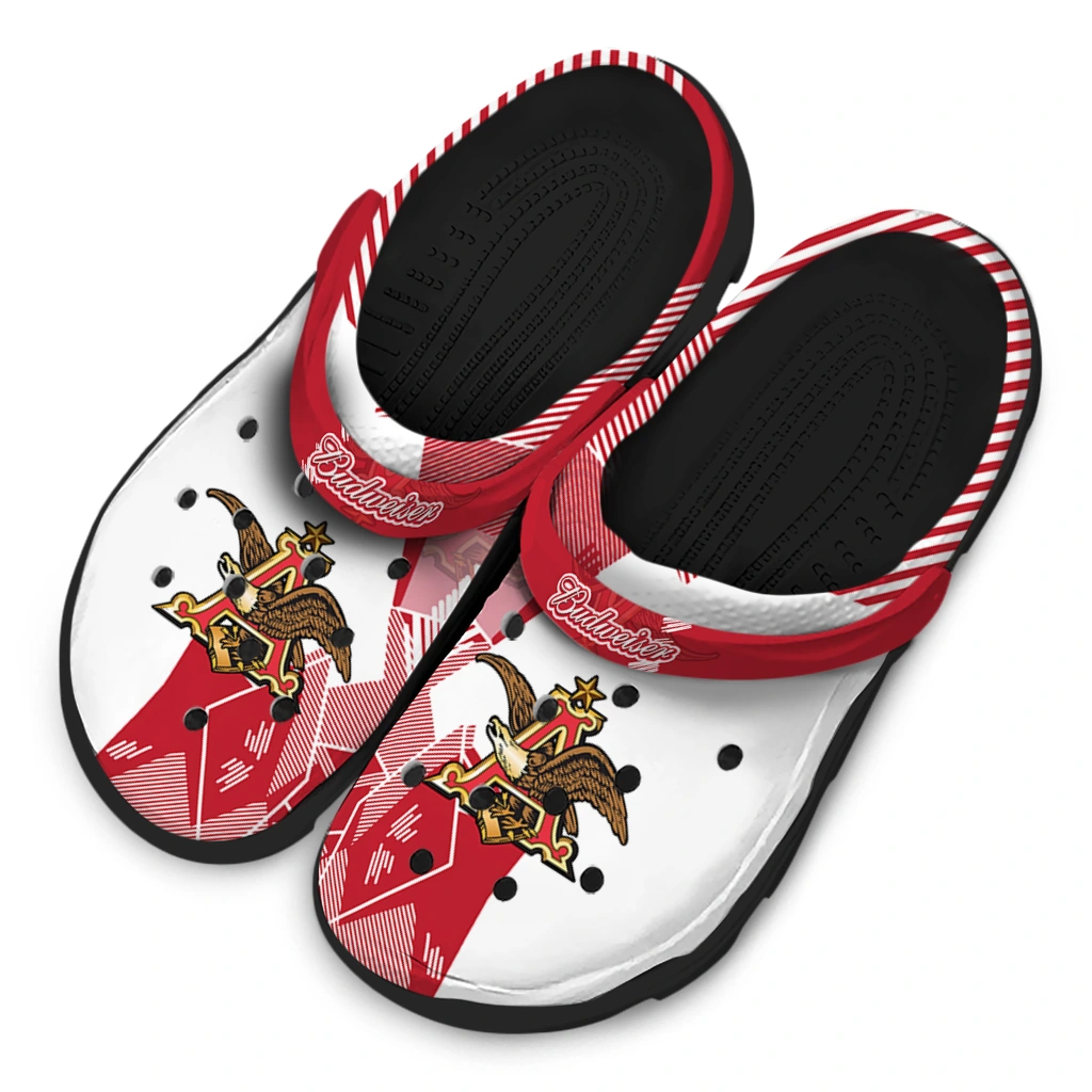The Budweiser Eagle Mark Red White Clogs from Hey Clogs slips on in seconds and keeps pace with your day, from slow mornings at home to city strolls and weekend getaways. Thoughtful design meets playful style with cheerful colors and prints that pop, adding personality to every step while delivering easy, breezy comfort and lightweight support wherever you wander.