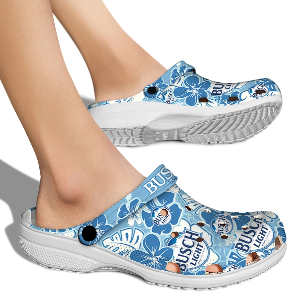 The Busch Light Logo Hibiscus Blue White Clogs from Hey Clogs slips on in seconds and keeps pace with your day, from slow mornings at home to city strolls and weekend getaways. Thoughtful design meets playful style with cheerful colors and prints that pop, adding personality to every step while delivering easy, breezy comfort and lightweight support wherever you wander.
