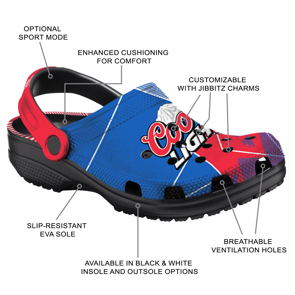 The Coors Light Beer Bold Typography Blue Red Clogs from Hey Clogs slips on in seconds and keeps pace with your day, from slow mornings at home to city strolls and weekend getaways. Thoughtful design meets playful style with cheerful colors and prints that pop, adding personality to every step while delivering easy, breezy comfort and lightweight support wherever you wander.