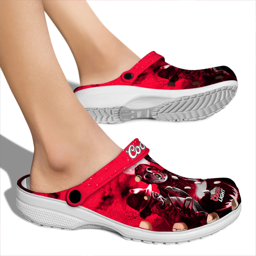 The Coors Light Beer Horror Legends Red Black Clogs from Hey Clogs slips on in seconds and keeps pace with your day, from slow mornings at home to city strolls and weekend getaways. Thoughtful design meets playful style with cheerful colors and prints that pop, adding personality to every step while delivering easy, breezy comfort and lightweight support wherever you wander.