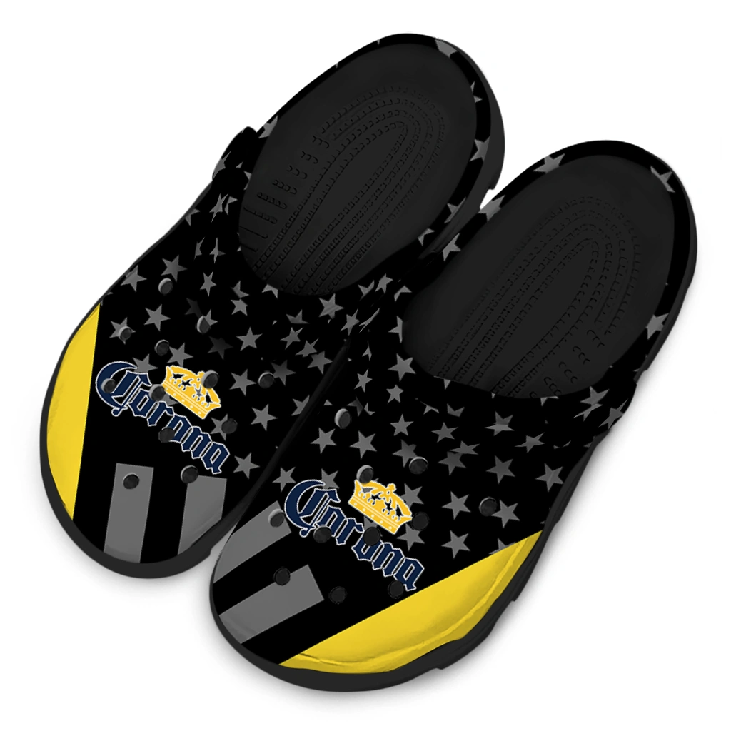The Corona Beer Star Pattern Black Yellow Clogs from Hey Clogs slips on in seconds and keeps pace with your day, from slow mornings at home to city strolls and weekend getaways. Thoughtful design meets playful style with cheerful colors and prints that pop, adding personality to every step while delivering easy, breezy comfort and lightweight support wherever you wander.