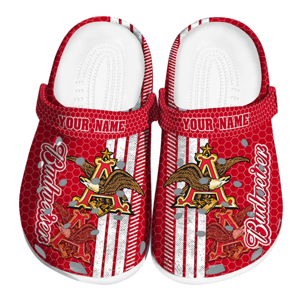 The Custom Budweiser Emblem Badge Red White Clogs from Hey Clogs slips on in seconds and keeps pace with your day – from slow mornings at home to city strolls and weekend getaways. Thoughtful design meets playful style with cheerful colors and prints that pop, adding personality to every step while delivering easy, breezy comfort and lightweight support wherever you wander. Want a signature touch? Customize yours with a name or initials for a one-of-one pair.