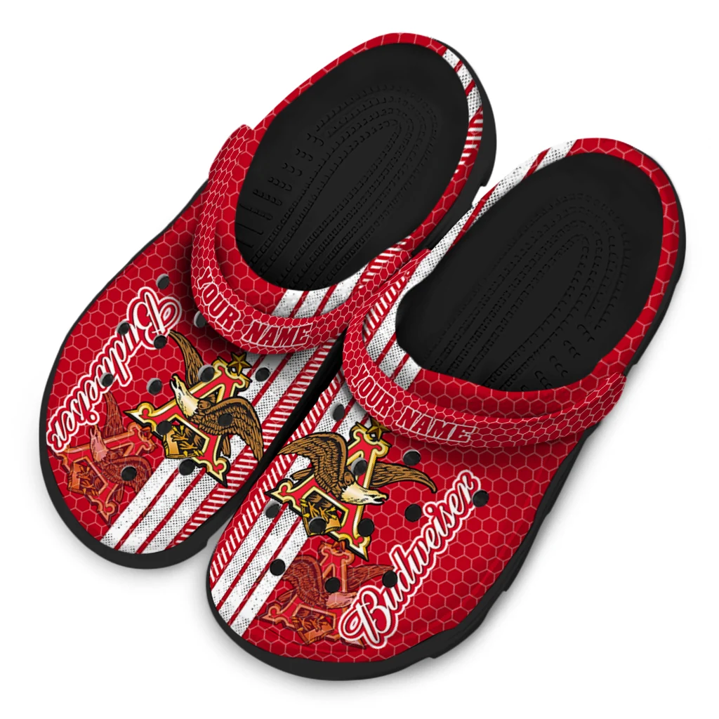 The Customized Budweiser Bold B Red White Clogs from Hey Clogs slips on in seconds and keeps pace with your day – from slow mornings at home to city strolls and weekend getaways. Thoughtful design meets playful style with cheerful colors and prints that pop, adding personality to every step while delivering easy, breezy comfort and lightweight support wherever you wander. Want a signature touch? Customize yours with a name or initials for a one-of-one pair.