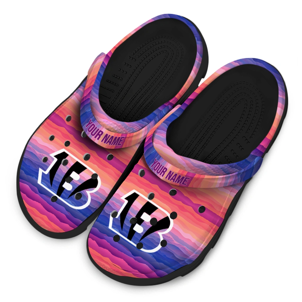 Your Clogs, Your Vibe, Your Name! Custom Cincinnati Bengals Wavy Stripes Clogs from Hey Clogs lets you take sport team-inspired style to a personal level! Featuring the bold colors you love, these featherlight clogs deliver unbeatable, all-day comfort. What a great way to make them truly yours: add your name to the heel strap! Perfect for gifting or treating yourself, these personalized clogs are a fun, spirited way to step out in comfort.