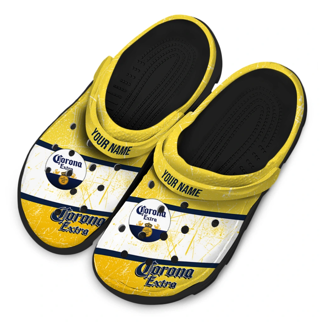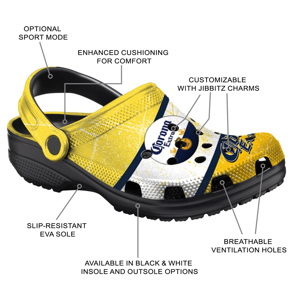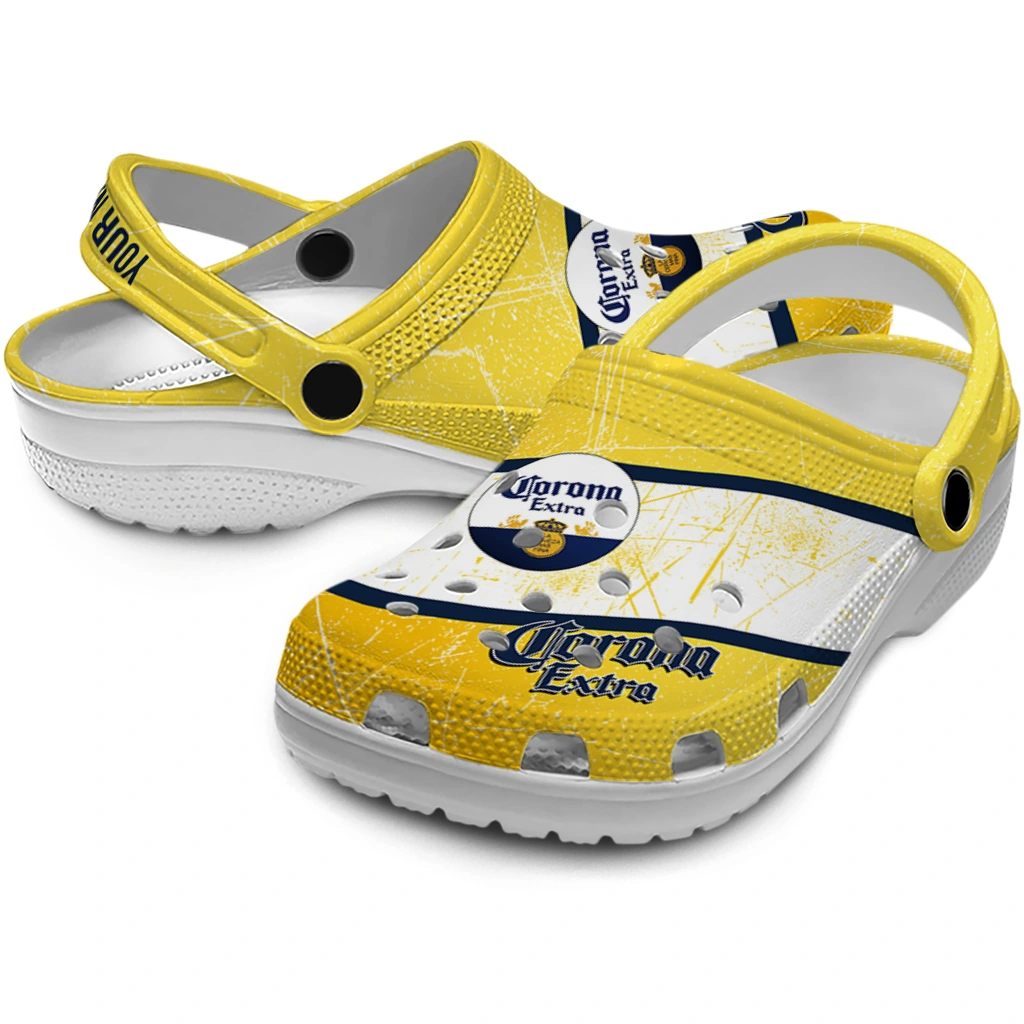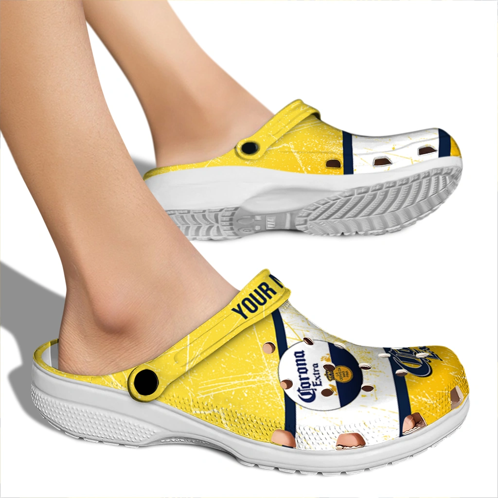 The Custom Corona Beer Corona League Yellow White Clogs from Hey Clogs slips on in seconds and keeps pace with your day – from slow mornings at home to city strolls and weekend getaways. Thoughtful design meets playful style with cheerful colors and prints that pop, adding personality to every step while delivering easy, breezy comfort and lightweight support wherever you wander. Want a signature touch? Customize yours with a name or initials for a one-of-one pair.