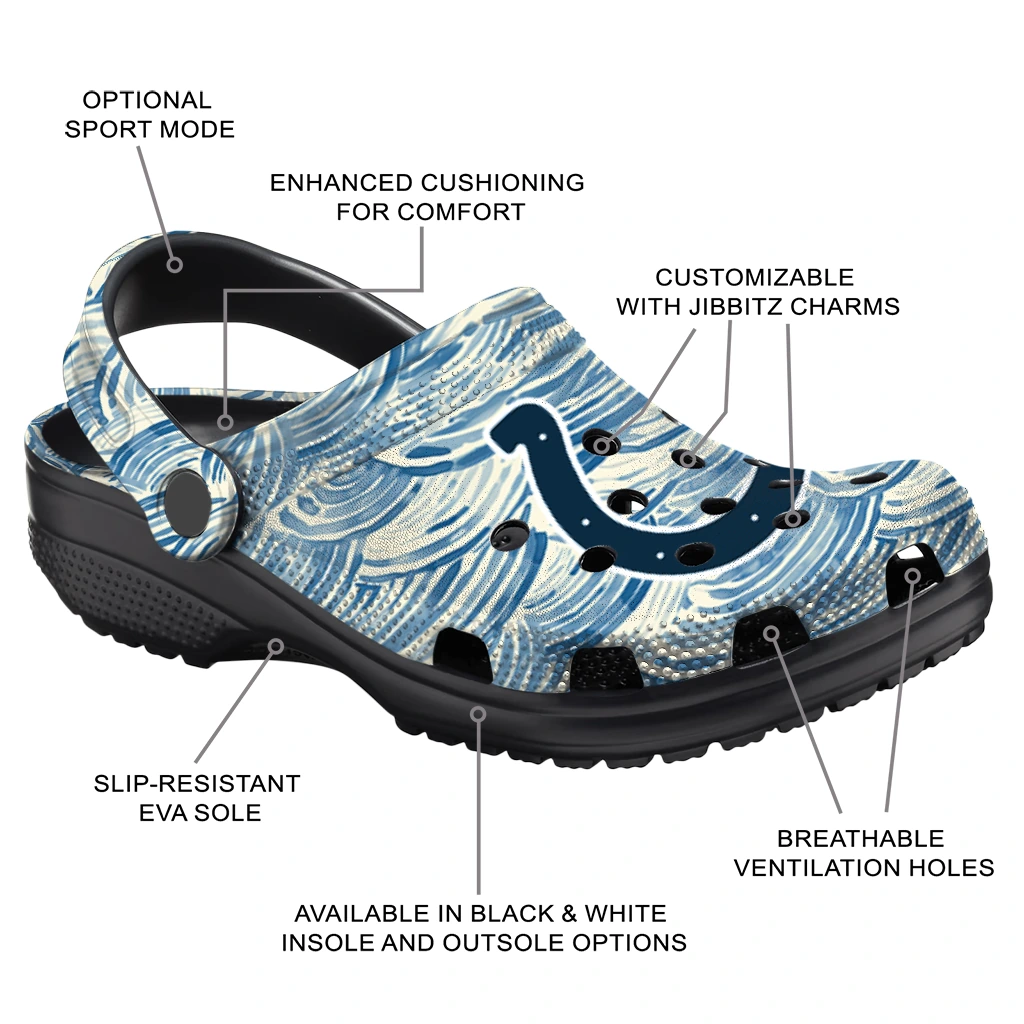 Your Clogs, Your Vibe, Your Name! Custom Indianapolis Colts Sea Swirls Clogs from Hey Clogs lets you take sport team-inspired style to a personal level! Featuring the bold colors you love, these featherlight clogs deliver unbeatable, all-day comfort. What a great way to make them truly yours: add your name to the heel strap! Perfect for gifting or treating yourself, these personalized clogs are a fun, spirited way to step out in comfort.