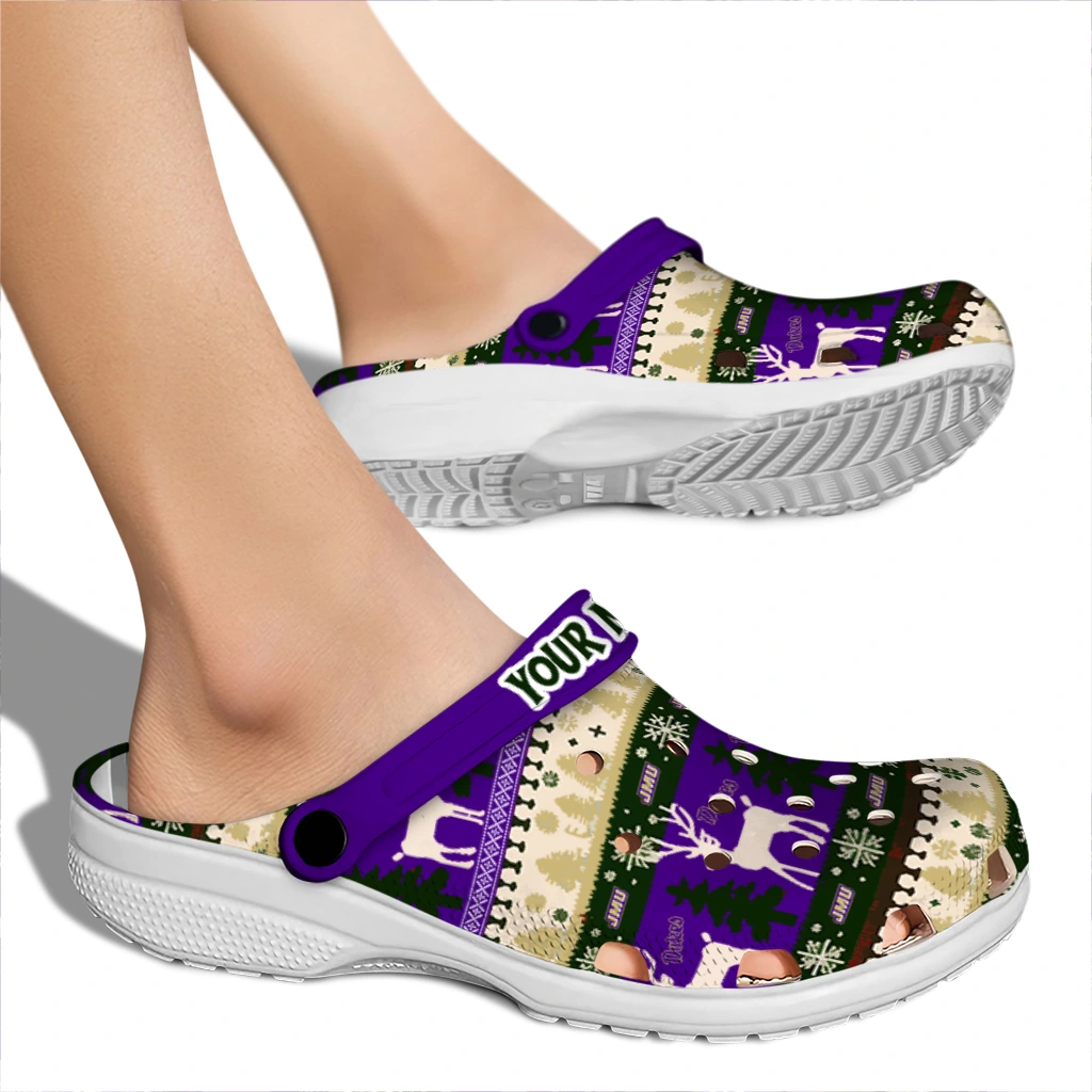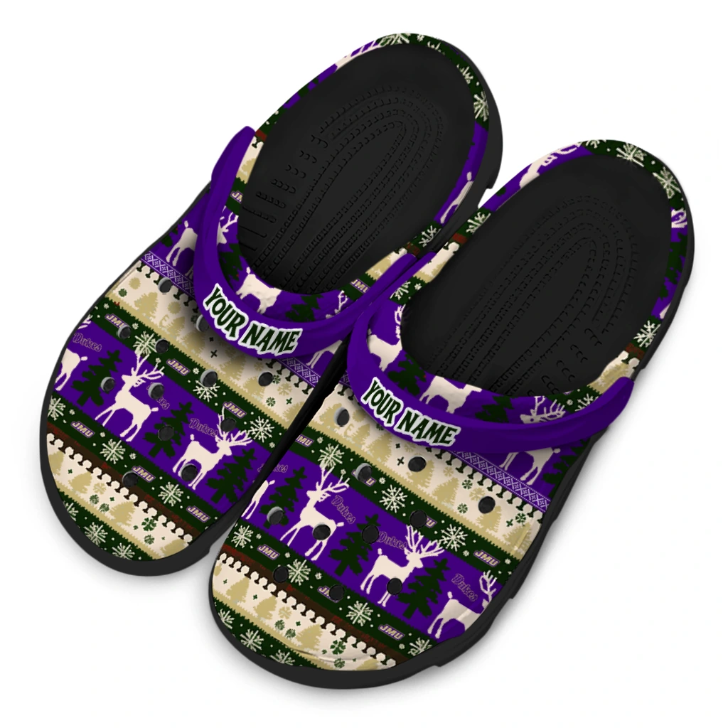 Your Clogs, Your Vibe, Your Name! Custom James Madison Dukes Christmas Motif Clogs from Hey Clogs lets you take sport team-inspired style to a personal level! Featuring the bold colors you love, these featherlight clogs deliver unbeatable, all-day comfort. What a great way to make them truly yours: add your name to the heel strap! Perfect for gifting or treating yourself, these personalized clogs are a fun, spirited way to step out in comfort.