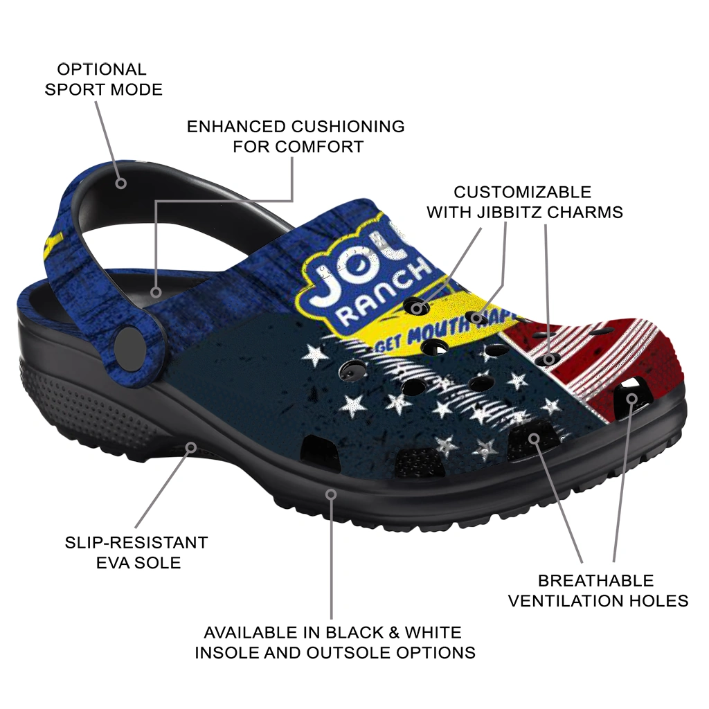 You’ll love it at first sight – and even more when it’s yours alone. Finish your clogs with a custom name or initials for a personal signature that stands out. Advanced UV printing keeps colors vivid without fading or peeling, so your look stays fresh from home lounging to errands, travel days, and lazy afternoons by the water. Easy to slip on and easy to love, the Custom Jolly rancher Patriotic Stars Blue Red Clogs brings together practicality, personality, and the playful spirit of Hey Clogs.