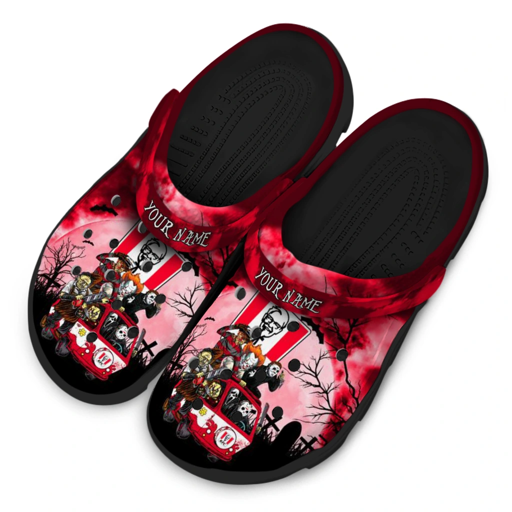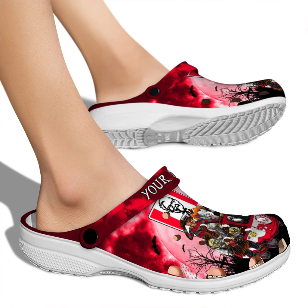 You’ll love it at first sight – and even more when it’s yours alone. Finish your clogs with a custom name or initials for a personal signature that stands out. Advanced UV printing keeps colors vivid without fading or peeling, so your look stays fresh from home lounging to errands, travel days, and lazy afternoons by the water. Easy to slip on and easy to love, the Custom KFC Horror Parade Red Black Clogs brings together practicality, personality, and the playful spirit of Hey Clogs.