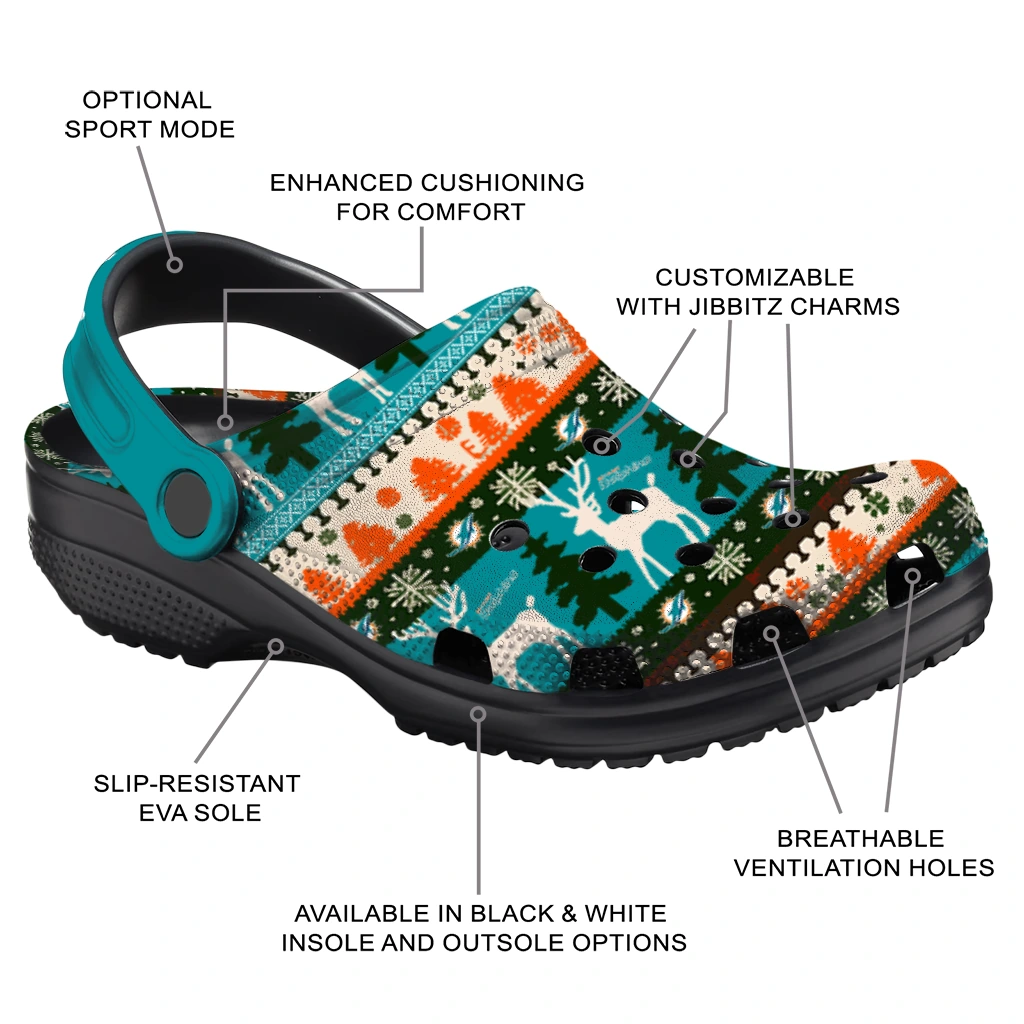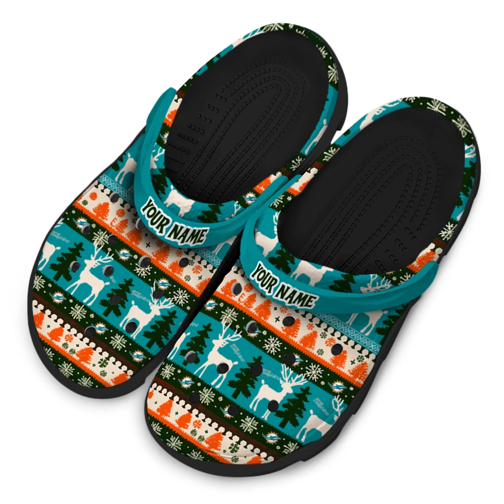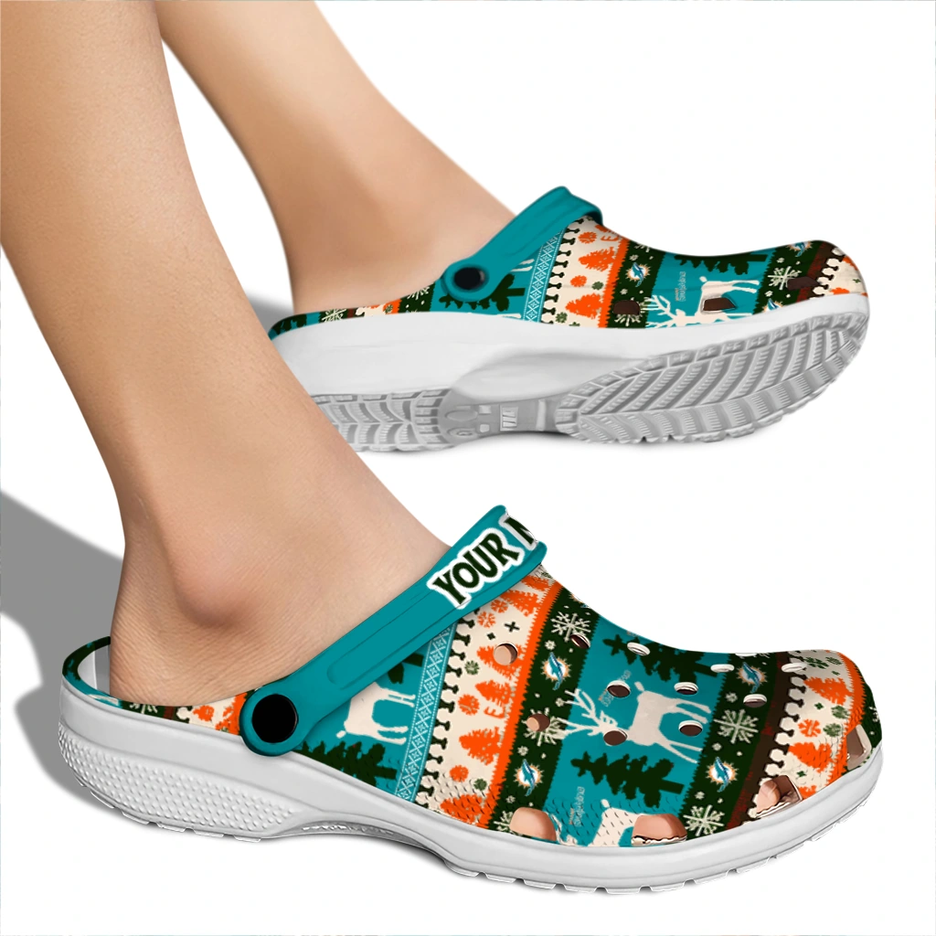 Your Clogs, Your Vibe, Your Name! Custom Miami Dolphins Christmas Motif Clogs from Hey Clogs lets you take sport team-inspired style to a personal level! Featuring the bold colors you love, these featherlight clogs deliver unbeatable, all-day comfort. What a great way to make them truly yours: add your name to the heel strap! Perfect for gifting or treating yourself, these personalized clogs are a fun, spirited way to step out in comfort.