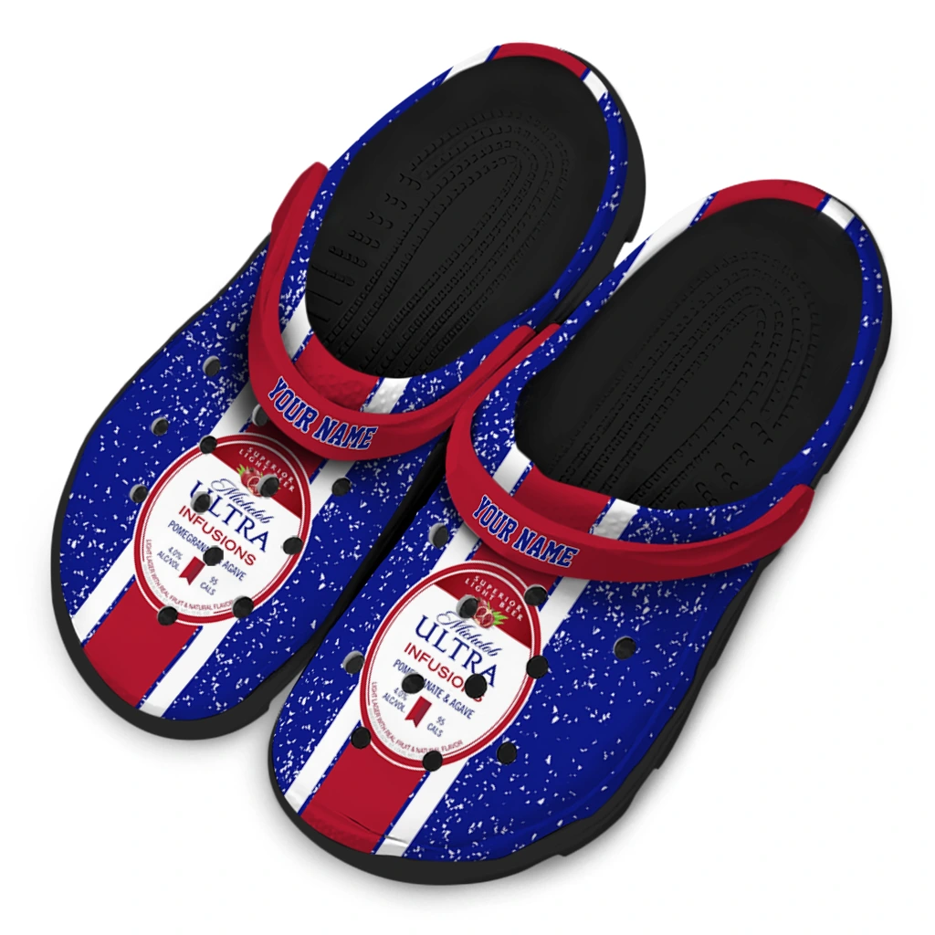 The Custom Michelob Ultra Branding Blue Red Clogs from Hey Clogs slips on in seconds and keeps pace with your day – from slow mornings at home to city strolls and weekend getaways. Thoughtful design meets playful style with cheerful colors and prints that pop, adding personality to every step while delivering easy, breezy comfort and lightweight support wherever you wander. Want a signature touch? Customize yours with a name or initials for a one-of-one pair.