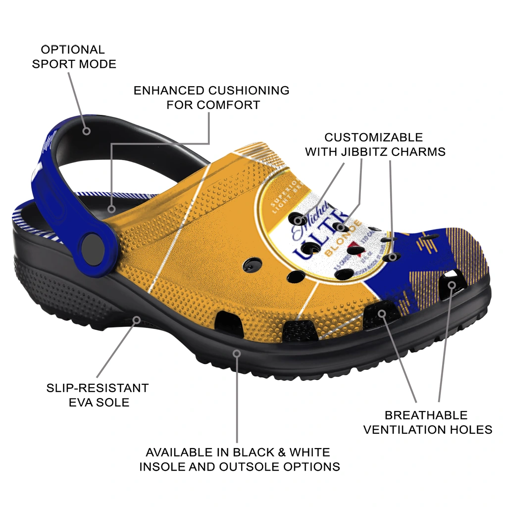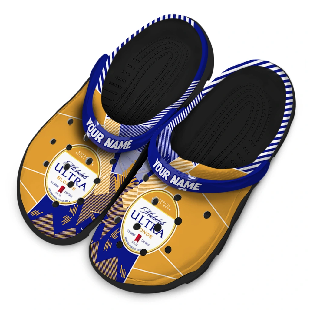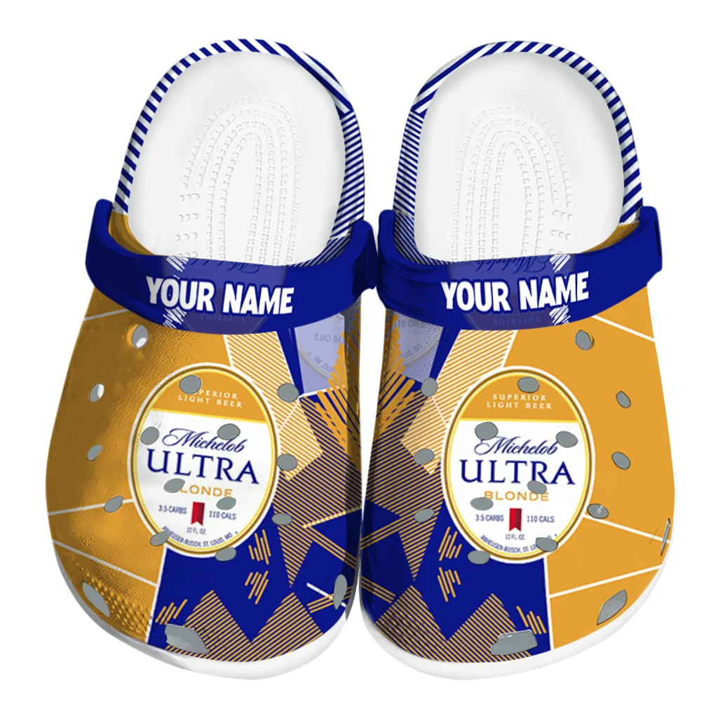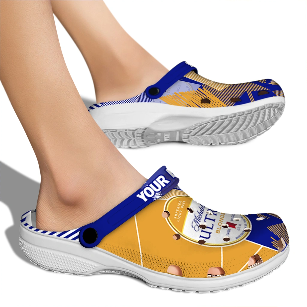 The Custom Michelob Ultra Striped Blocks Blue Yellow Clogs from Hey Clogs slips on in seconds and keeps pace with your day – from slow mornings at home to city strolls and weekend getaways. Thoughtful design meets playful style with cheerful colors and prints that pop, adding personality to every step while delivering easy, breezy comfort and lightweight support wherever you wander. Want a signature touch? Customize yours with a name or initials for a one-of-one pair.