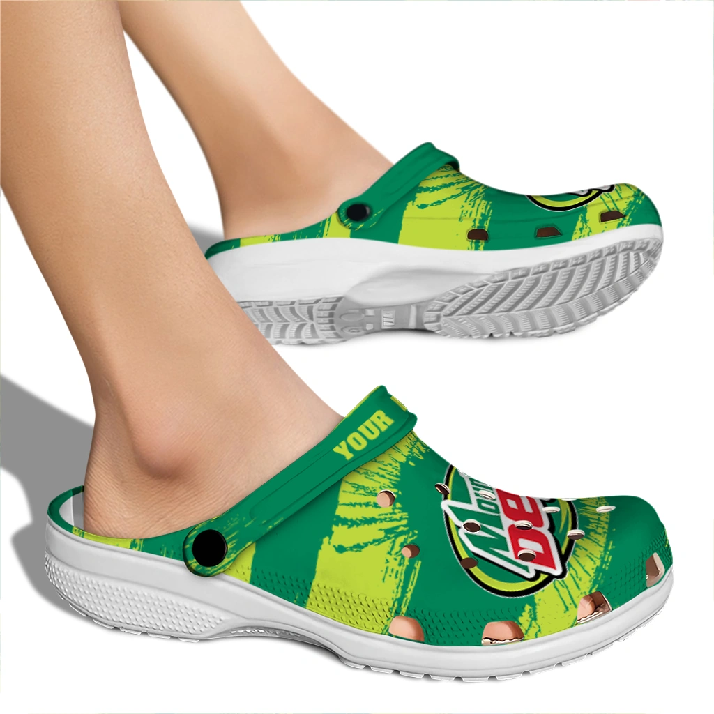 The Custom Mountain Dew Center Logo Green Yellow Clogs from Hey Clogs slips on in seconds and keeps pace with your day – from slow mornings at home to city strolls and weekend getaways. Thoughtful design meets playful style with cheerful colors and prints that pop, adding personality to every step while delivering easy, breezy comfort and lightweight support wherever you wander. Want a signature touch? Customize yours with a name or initials for a one-of-one pair.