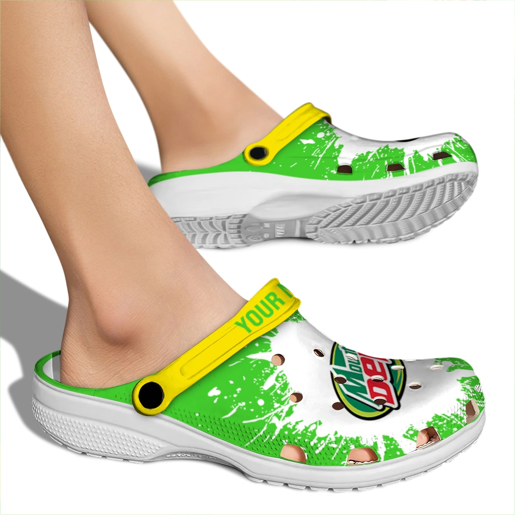 The Custom Mountain Dew Splat Art Green Yellow Clogs from Hey Clogs slips on in seconds and keeps pace with your day – from slow mornings at home to city strolls and weekend getaways. Thoughtful design meets playful style with cheerful colors and prints that pop, adding personality to every step while delivering easy, breezy comfort and lightweight support wherever you wander. Want a signature touch? Customize yours with a name or initials for a one-of-one pair.