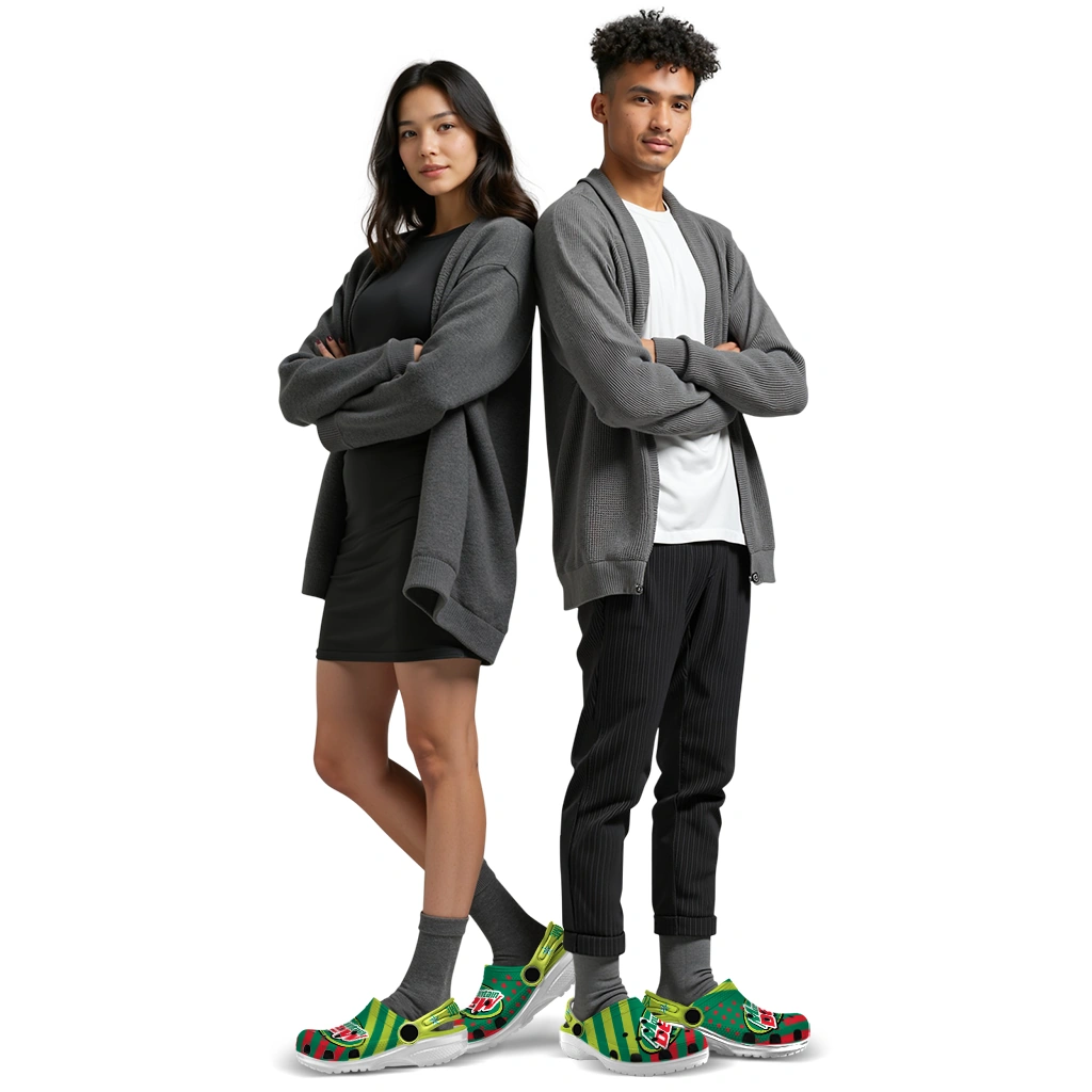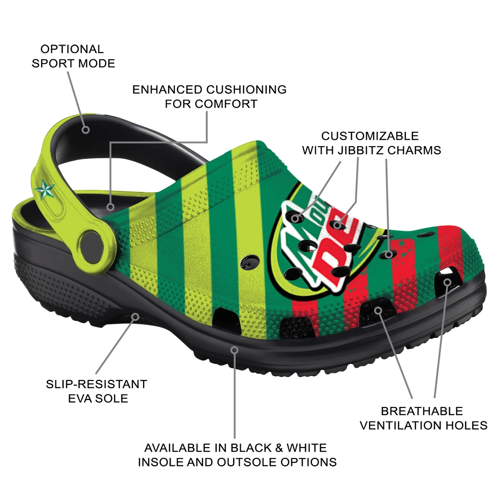 The Custom Mountain Dew Stars Green Red Clogs from Hey Clogs slips on in seconds and keeps pace with your day – from slow mornings at home to city strolls and weekend getaways. Thoughtful design meets playful style with cheerful colors and prints that pop, adding personality to every step while delivering easy, breezy comfort and lightweight support wherever you wander. Want a signature touch? Customize yours with a name or initials for a one-of-one pair.