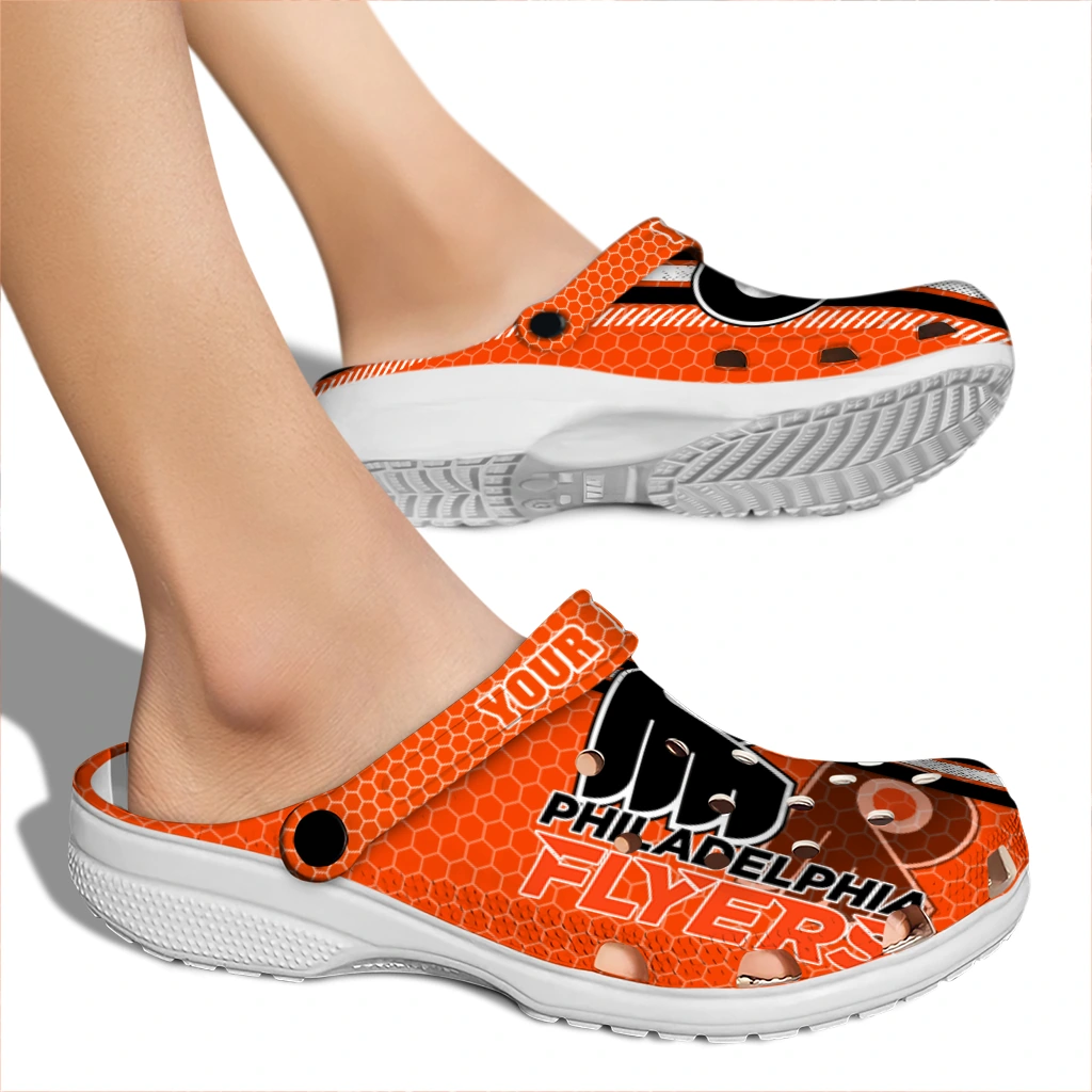 Your Clogs, Your Vibe, Your Name! Custom Philadelphia Flyers Contrasting Stripes Clogs from Hey Clogs lets you take sport team-inspired style to a personal level! Featuring the bold colors you love, these featherlight clogs deliver unbeatable, all-day comfort. What a great way to make them truly yours: add your name to the heel strap! Perfect for gifting or treating yourself, these personalized clogs are a fun, spirited way to step out in comfort.