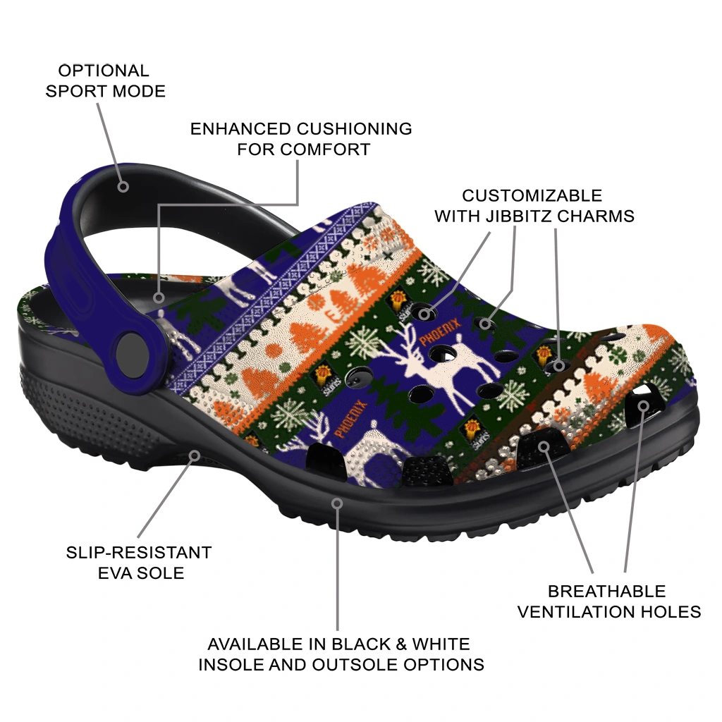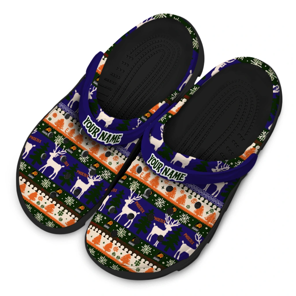 Your Clogs, Your Vibe, Your Name! Custom Phoenix Suns Christmas Motif Clogs from Hey Clogs lets you take sport team-inspired style to a personal level! Featuring the bold colors you love, these featherlight clogs deliver unbeatable, all-day comfort. What a great way to make them truly yours: add your name to the heel strap! Perfect for gifting or treating yourself, these personalized clogs are a fun, spirited way to step out in comfort.