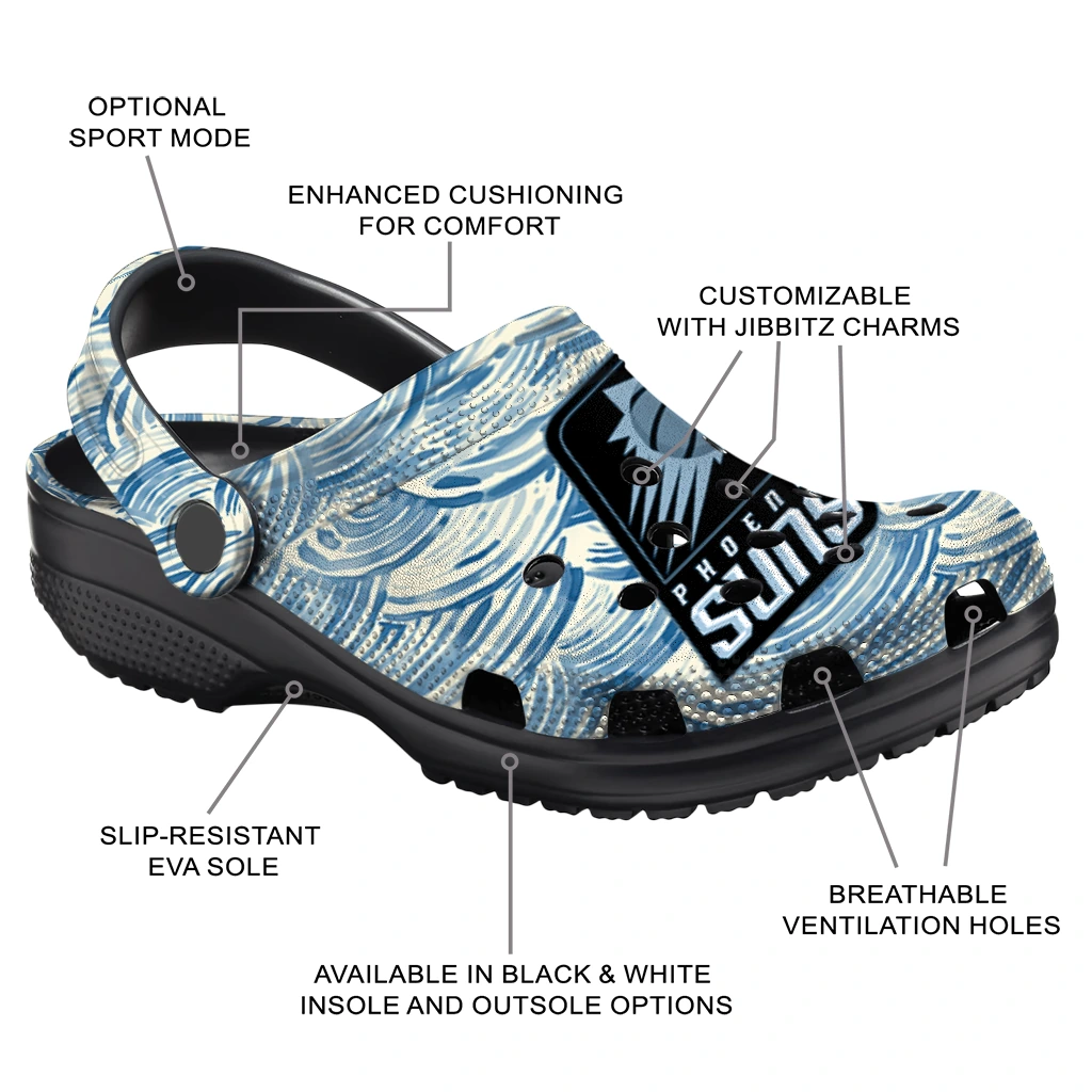 Comfort and Customization – What a Perfect Combination! Want footwear that stands out in the crowd? You found it! The Custom Fan Spirit Clogs – Custom Phoenix Suns Sea Swirls Clogs blend the fantastic comfort of lightweight EVA with a design inspired by the biggest sports teams. They’re durable, supportive, and so easy to wear!