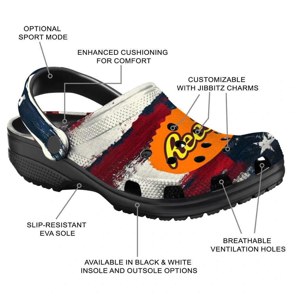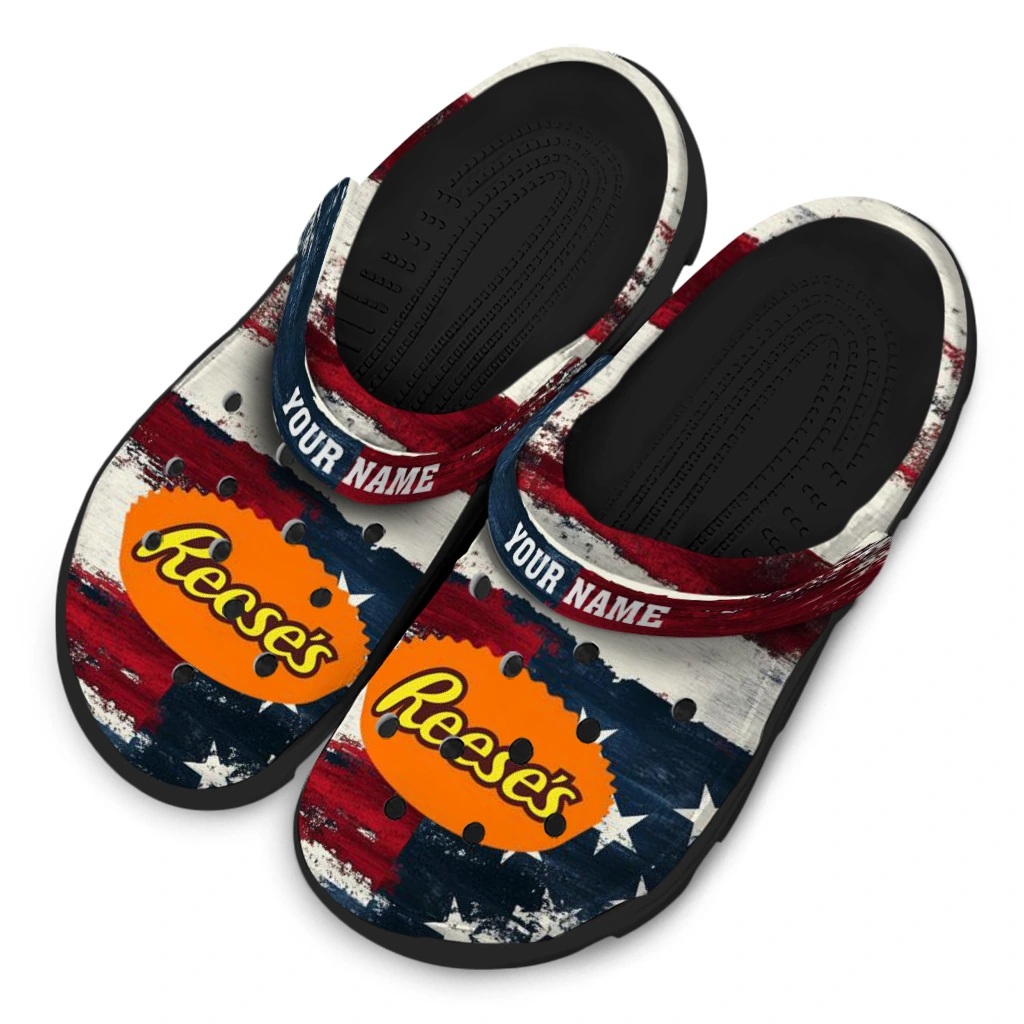 You’ll love it at first sight – and even more when it’s yours alone. Finish your clogs with a custom name or initials for a personal signature that stands out. Advanced UV printing keeps colors vivid without fading or peeling, so your look stays fresh from home lounging to errands, travel days, and lazy afternoons by the water. Easy to slip on and easy to love, the Custom Reese’s USA Flag Red White Clogs brings together practicality, personality, and the playful spirit of Hey Clogs.