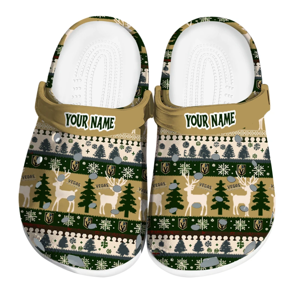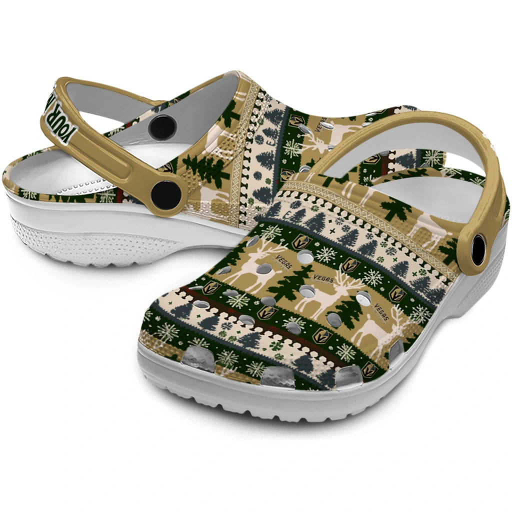 Your Clogs, Your Vibe, Your Name! Custom Vegas Golden Knights Christmas Motif Clogs from Hey Clogs lets you take sport team-inspired style to a personal level! Featuring the bold colors you love, these featherlight clogs deliver unbeatable, all-day comfort. What a great way to make them truly yours: add your name to the heel strap! Perfect for gifting or treating yourself, these personalized clogs are a fun, spirited way to step out in comfort.