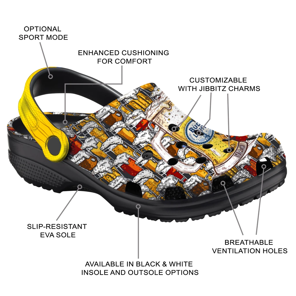 You’ll love it at first sight – and even more when it’s yours alone. Finish your clogs with a custom name or initials for a personal signature that stands out. Advanced UV printing keeps colors vivid without fading or peeling, so your look stays fresh from home lounging to errands, travel days, and lazy afternoons by the water. Easy to slip on and easy to love, the Customized Bud light Mug Froth Yellow Brown Clogs brings together practicality, personality, and the playful spirit of Hey Clogs.