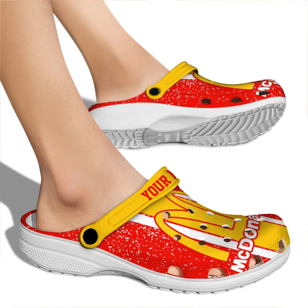 You’ll love it at first sight – and even more when it’s yours alone. Finish your clogs with a custom name or initials for a personal signature that stands out. Advanced UV printing keeps colors vivid without fading or peeling, so your look stays fresh from home lounging to errands, travel days, and lazy afternoons by the water. Easy to slip on and easy to love, the Customized McDonald’s Arches Bold Red Yellow Clogs brings together practicality, personality, and the playful spirit of Hey Clogs.