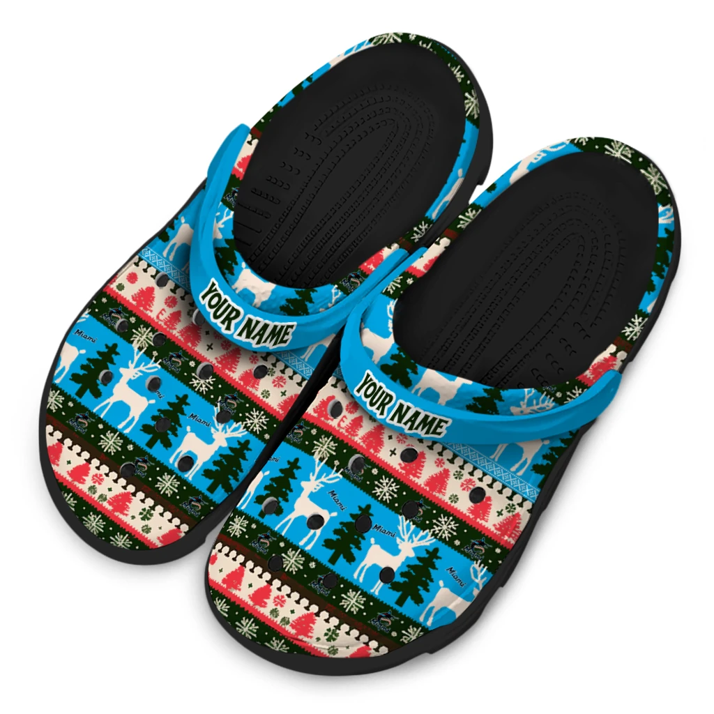 Your Clogs, Your Vibe, Your Name! Customized Miami Marlins Christmas Motif Clogs from Hey Clogs lets you take sport team-inspired style to a personal level! Featuring the bold colors you love, these featherlight clogs deliver unbeatable, all-day comfort. What a great way to make them truly yours: add your name to the heel strap! Perfect for gifting or treating yourself, these personalized clogs are a fun, spirited way to step out in comfort.