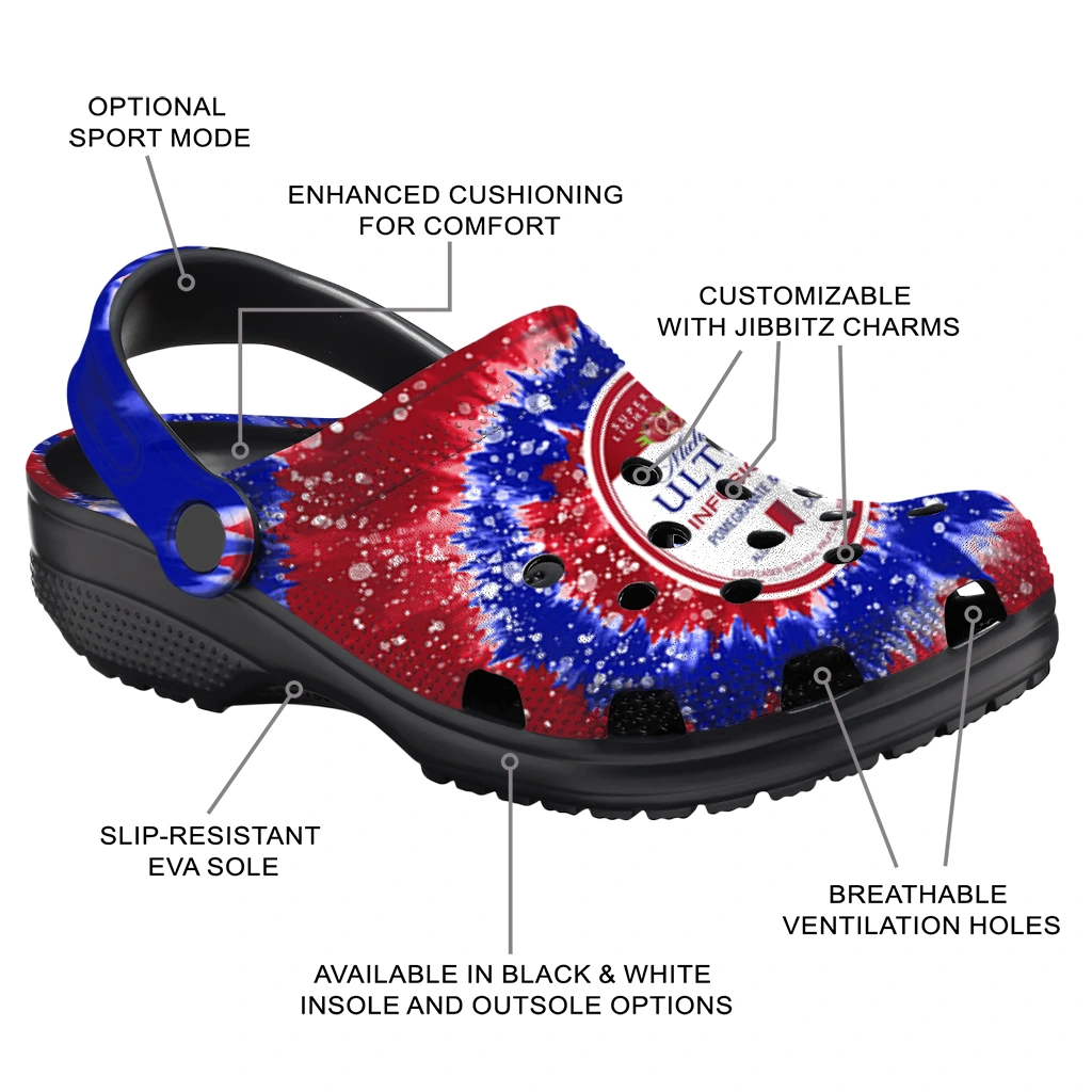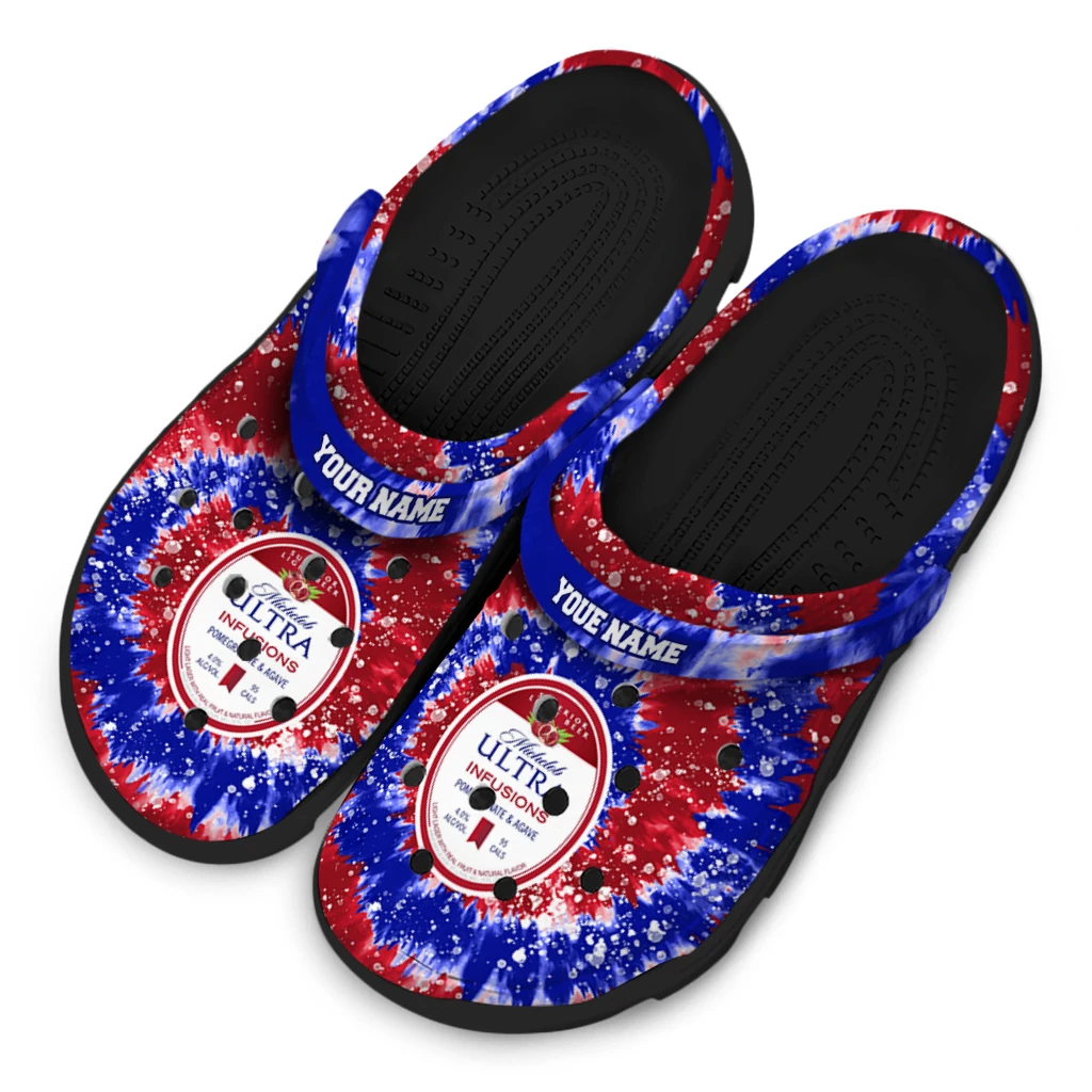 The Customized Michelob Ultra Spiral Splash Red Blue Clogs from Hey Clogs slips on in seconds and keeps pace with your day – from slow mornings at home to city strolls and weekend getaways. Thoughtful design meets playful style with cheerful colors and prints that pop, adding personality to every step while delivering easy, breezy comfort and lightweight support wherever you wander. Want a signature touch? Customize yours with a name or initials for a one-of-one pair.