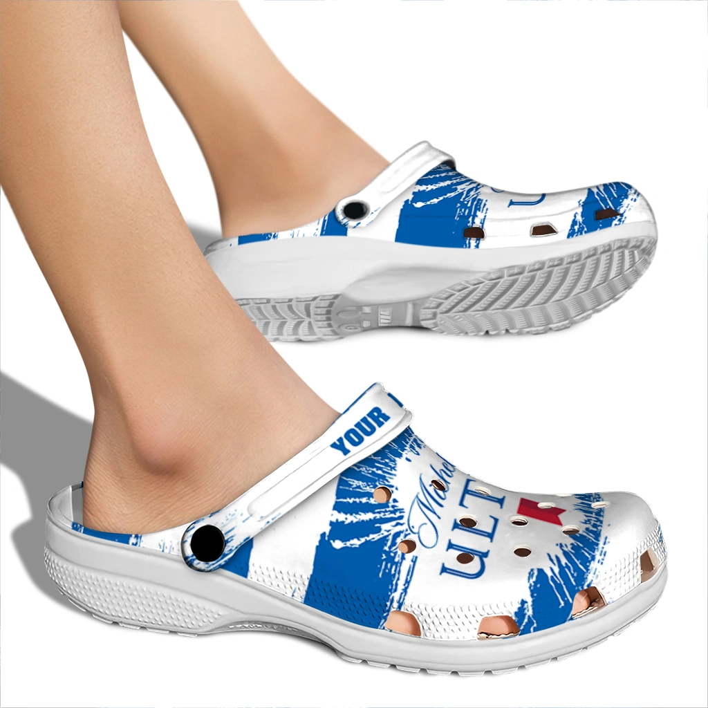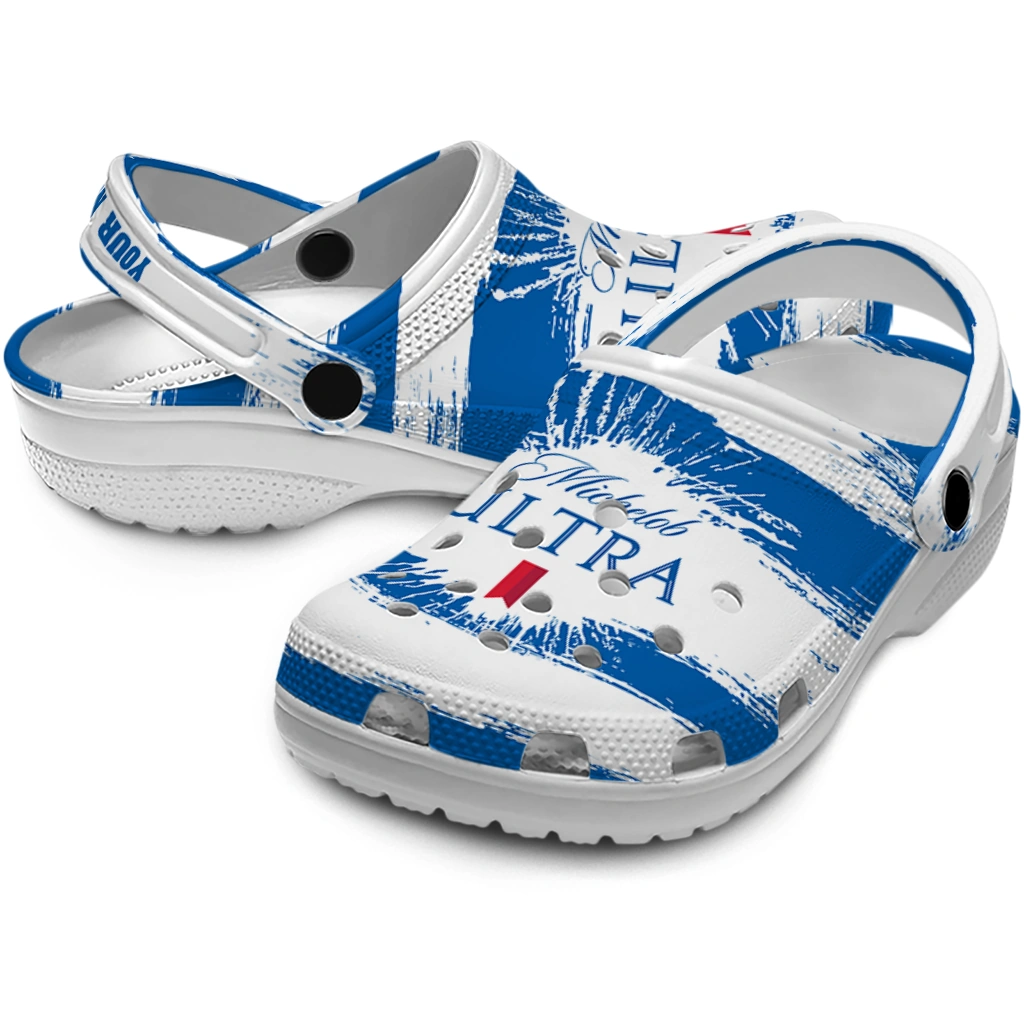 The Customized Michelob Ultra Stripes Blue White Clogs from Hey Clogs slips on in seconds and keeps pace with your day – from slow mornings at home to city strolls and weekend getaways. Thoughtful design meets playful style with cheerful colors and prints that pop, adding personality to every step while delivering easy, breezy comfort and lightweight support wherever you wander. Want a signature touch? Customize yours with a name or initials for a one-of-one pair.