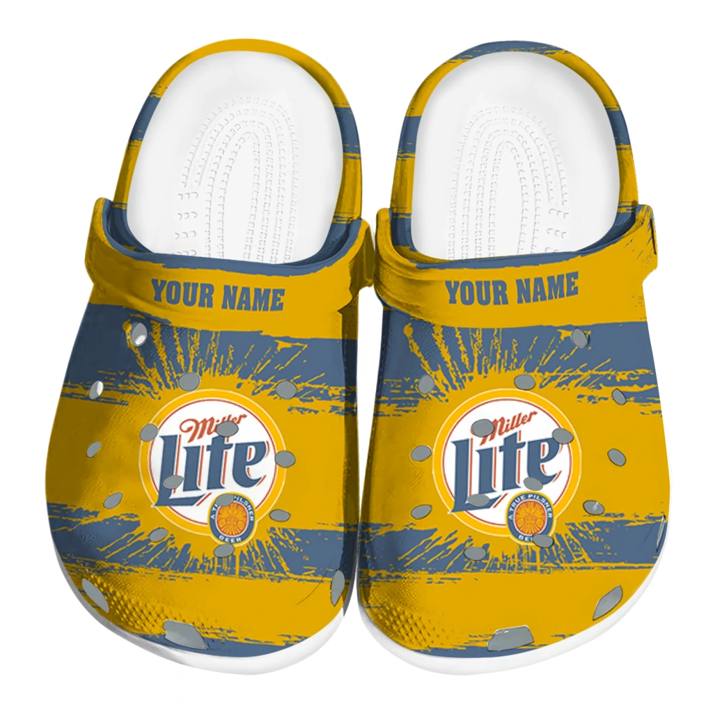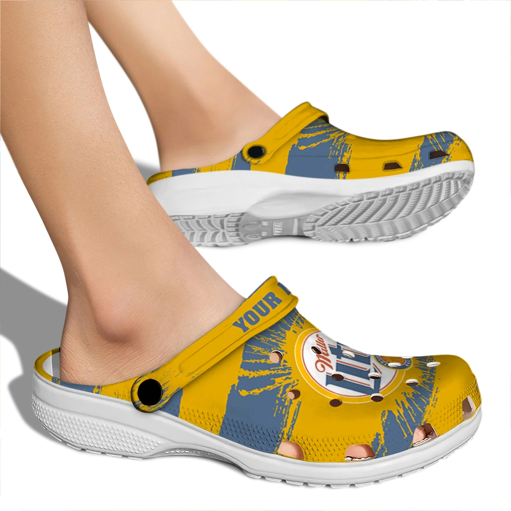 The Customized Miller Lite Sunburst Centerpiece Yellow Blue Clogs from Hey Clogs slips on in seconds and keeps pace with your day – from slow mornings at home to city strolls and weekend getaways. Thoughtful design meets playful style with cheerful colors and prints that pop, adding personality to every step while delivering easy, breezy comfort and lightweight support wherever you wander. Want a signature touch? Customize yours with a name or initials for a one-of-one pair.