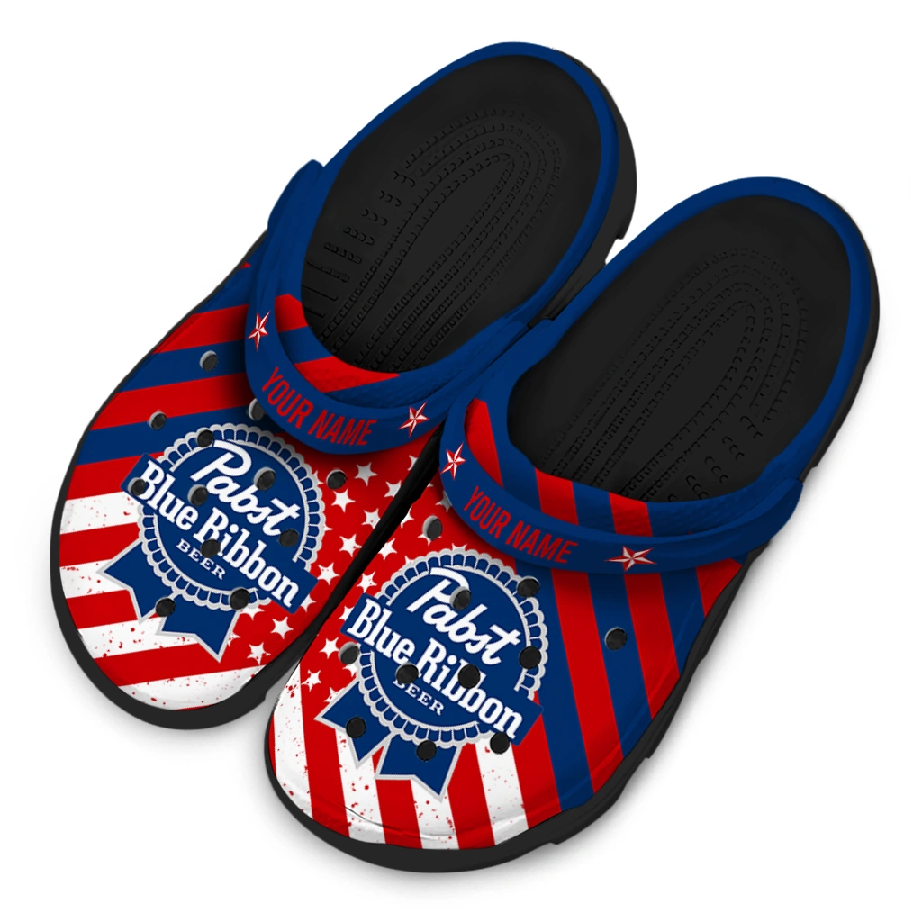 The Customized Pabst Blue Ribbon USA Flag Red White Clogs from Hey Clogs slips on in seconds and keeps pace with your day – from slow mornings at home to city strolls and weekend getaways. Thoughtful design meets playful style with cheerful colors and prints that pop, adding personality to every step while delivering easy, breezy comfort and lightweight support wherever you wander. Want a signature touch? Customize yours with a name or initials for a one-of-one pair.