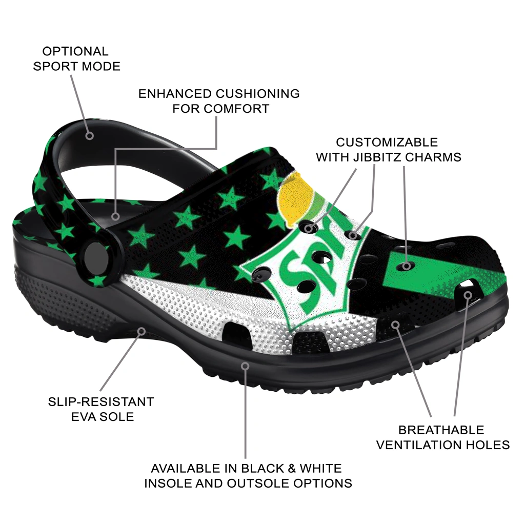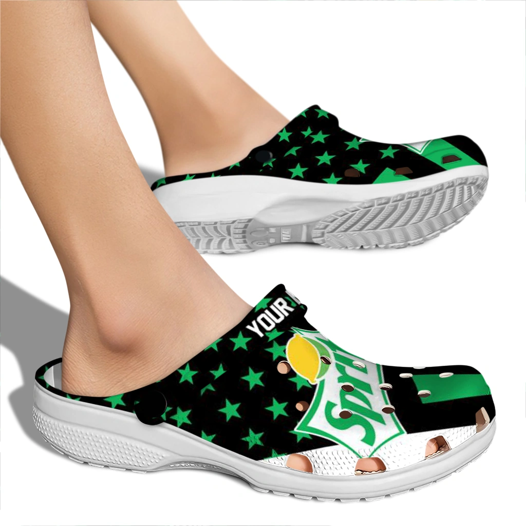 The Customized Sprite Green Stars Black Green Clogs from Hey Clogs slips on in seconds and keeps pace with your day – from slow mornings at home to city strolls and weekend getaways. Thoughtful design meets playful style with cheerful colors and prints that pop, adding personality to every step while delivering easy, breezy comfort and lightweight support wherever you wander. Want a signature touch? Customize yours with a name or initials for a one-of-one pair.