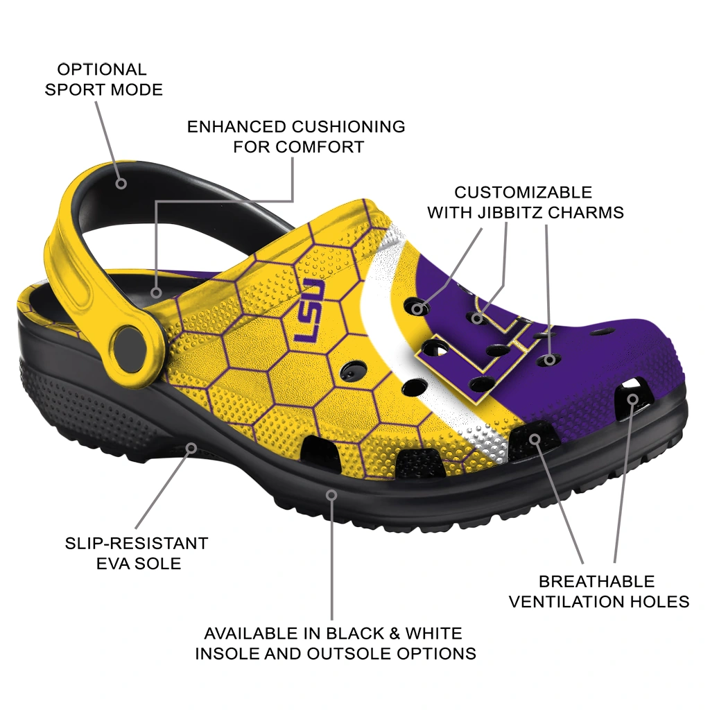 Show your spirit with the ultimate comfort clog! The All-Star Spirit Comfort Clogs – LSU Tigers Hexagon Grid Clogs are designed to keep pace with your active life while showcasing your love for the game. We’ve combined featherlight EVA material with bold, team-inspired color patterns! These clogs are a home run for versatility, offering slip-on ease, breezy comfort, and a vibrant look that travels effortlessly from the stadium parking lot to your sofa. What an easy way to cheer on your team!