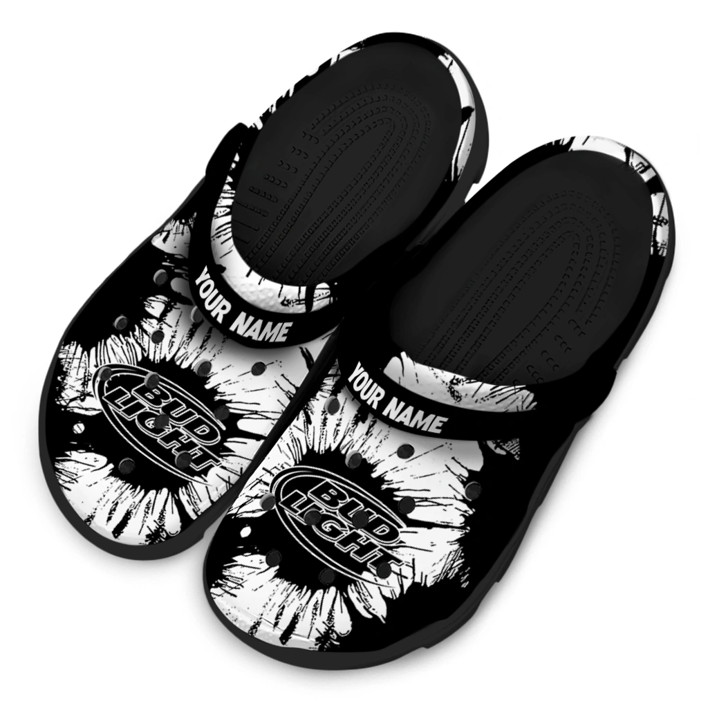The Personalized Bud light Black Splash Black White Clogs from Hey Clogs slips on in seconds and keeps pace with your day – from slow mornings at home to city strolls and weekend getaways. Thoughtful design meets playful style with cheerful colors and prints that pop, adding personality to every step while delivering easy, breezy comfort and lightweight support wherever you wander. Want a signature touch? Customize yours with a name or initials for a one-of-one pair.