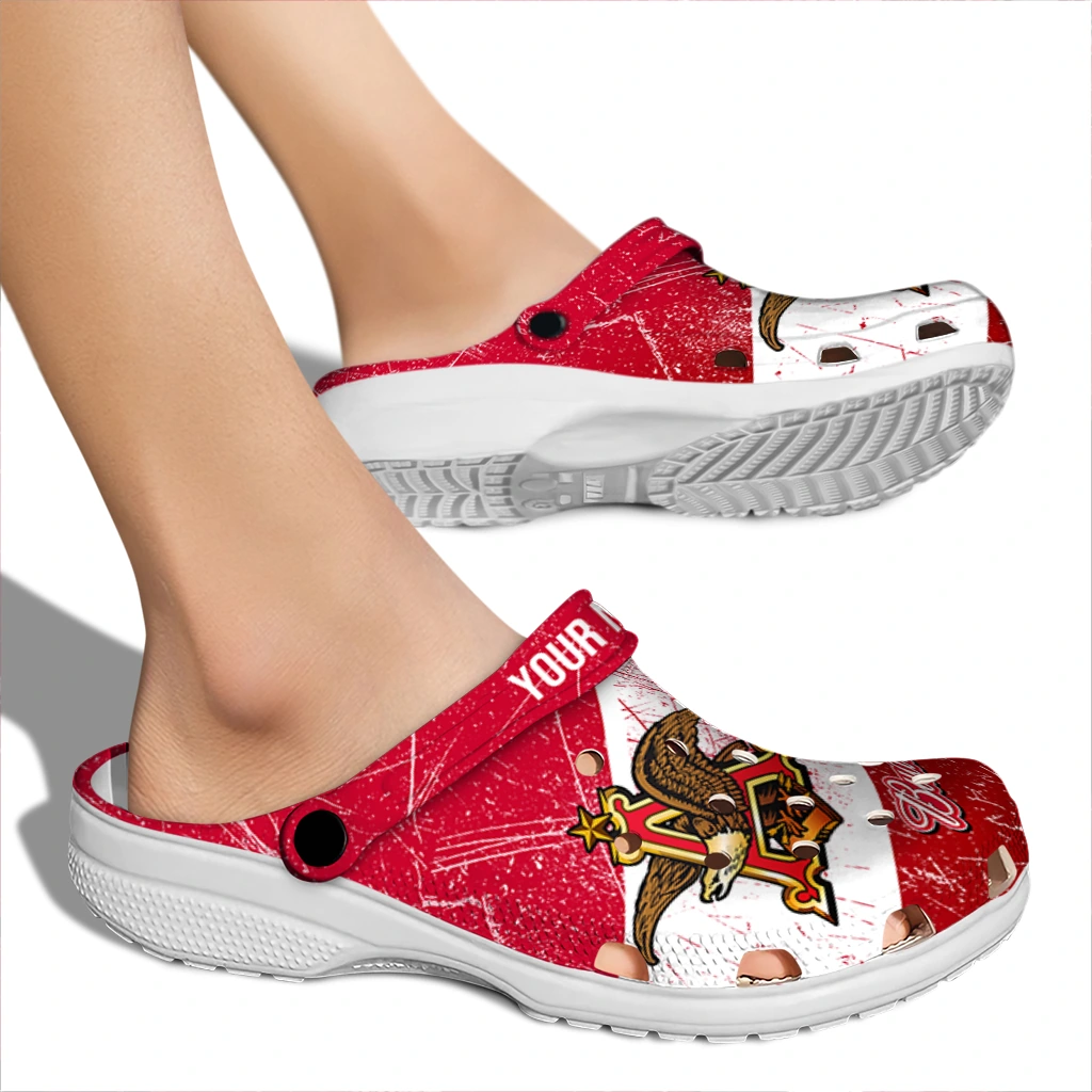 The Personalized Budweiser Eagle Logo Red White Clogs from Hey Clogs slips on in seconds and keeps pace with your day – from slow mornings at home to city strolls and weekend getaways. Thoughtful design meets playful style with cheerful colors and prints that pop, adding personality to every step while delivering easy, breezy comfort and lightweight support wherever you wander. Want a signature touch? Customize yours with a name or initials for a one-of-one pair.