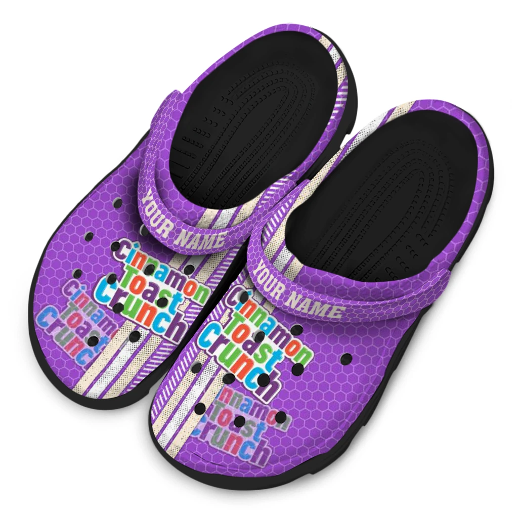 The Personalized Cinamon Toast Crunch Cinnamon Logo Purple White Clogs from Hey Clogs slips on in seconds and keeps pace with your day – from slow mornings at home to city strolls and weekend getaways. Thoughtful design meets playful style with cheerful colors and prints that pop, adding personality to every step while delivering easy, breezy comfort and lightweight support wherever you wander. Want a signature touch? Customize yours with a name or initials for a one-of-one pair.