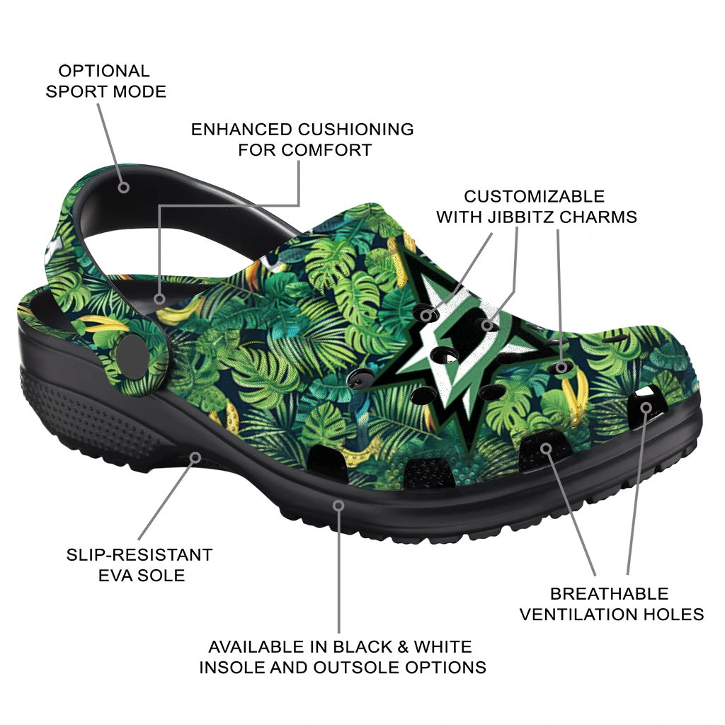 Your Clogs, Your Vibe, Your Name! Personalized Dallas Stars Tropical Leaves Clogs from Hey Clogs lets you take sport team-inspired style to a personal level! Featuring the bold colors you love, these featherlight clogs deliver unbeatable, all-day comfort. What a great way to make them truly yours: add your name to the heel strap! Perfect for gifting or treating yourself, these personalized clogs are a fun, spirited way to step out in comfort.