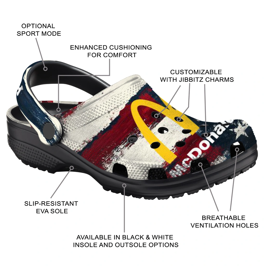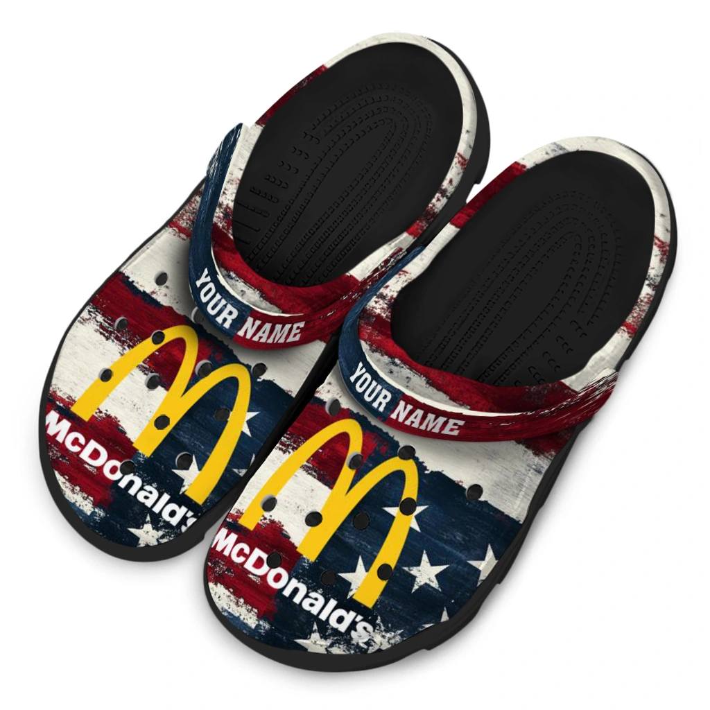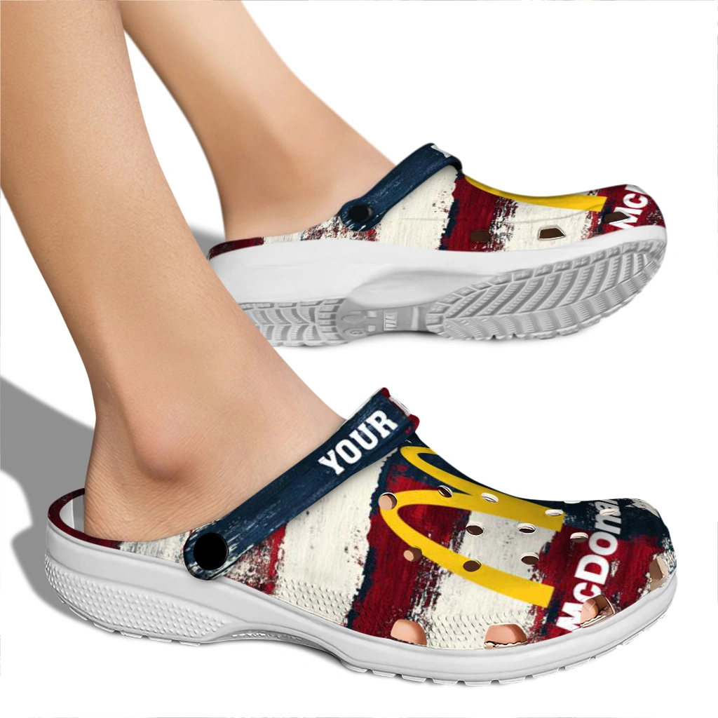 The Personalized McDonald’s Flag Arches Red White Clogs from Hey Clogs slips on in seconds and keeps pace with your day – from slow mornings at home to city strolls and weekend getaways. Thoughtful design meets playful style with cheerful colors and prints that pop, adding personality to every step while delivering easy, breezy comfort and lightweight support wherever you wander. Want a signature touch? Customize yours with a name or initials for a one-of-one pair.