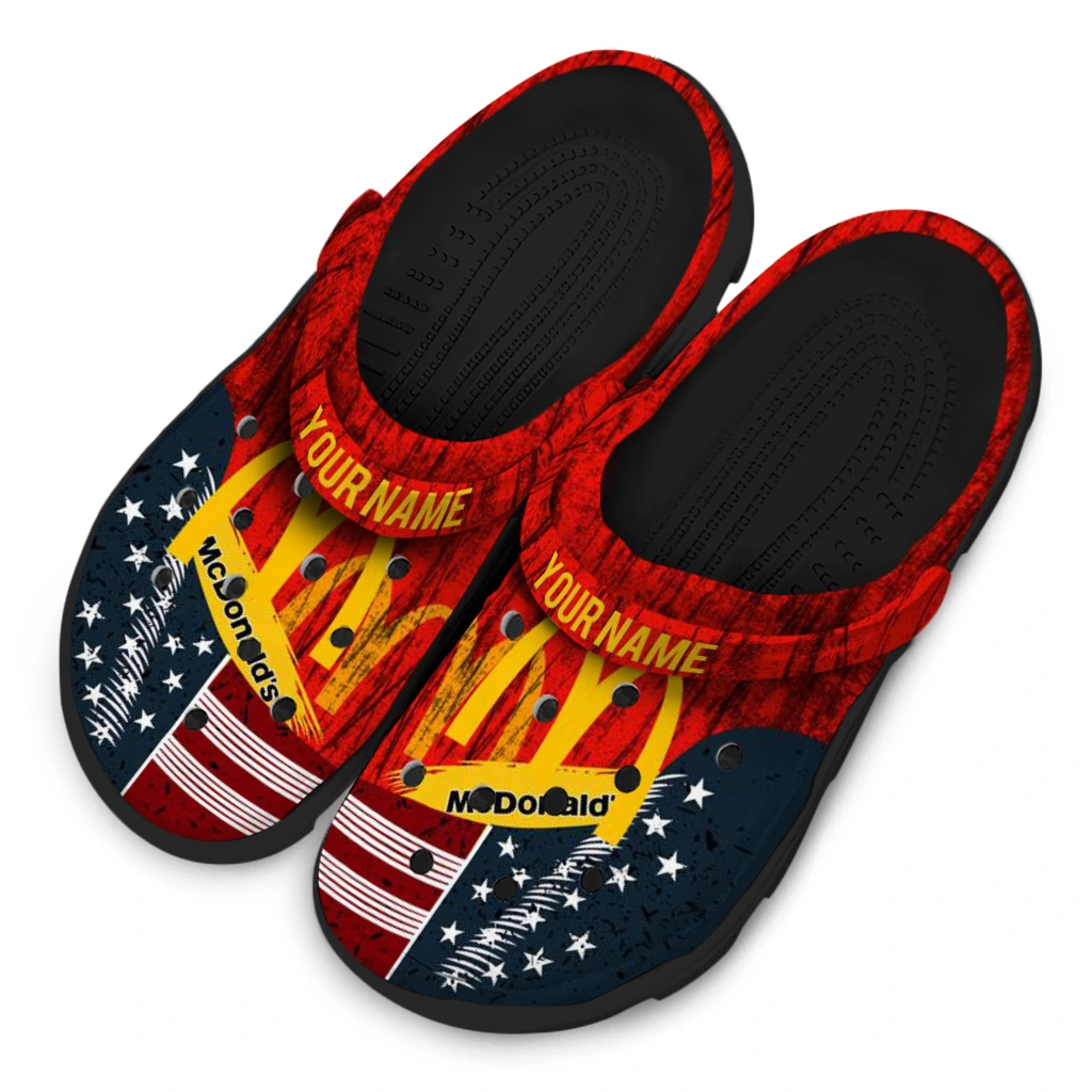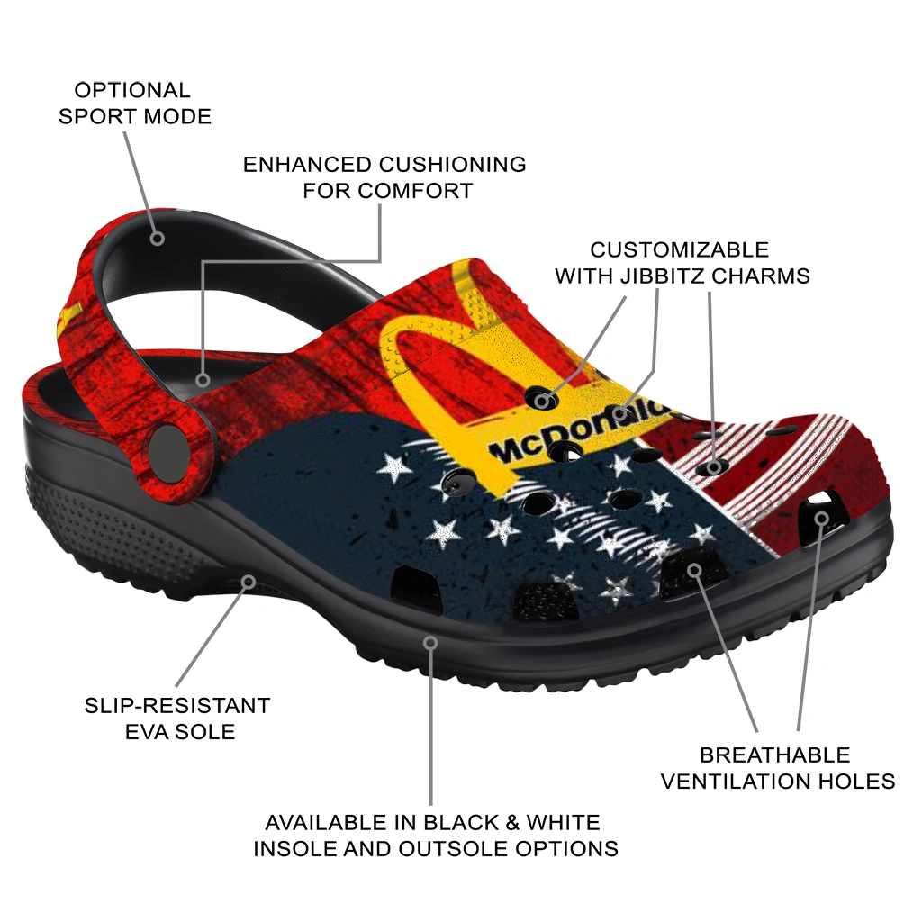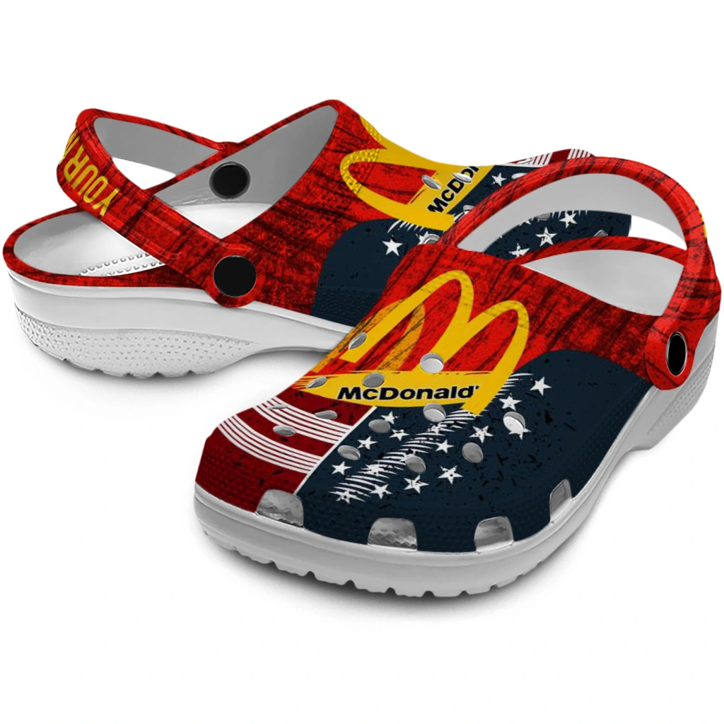 The Personalized McDonald’s Patriotic Burger Red Blue Clogs from Hey Clogs slips on in seconds and keeps pace with your day – from slow mornings at home to city strolls and weekend getaways. Thoughtful design meets playful style with cheerful colors and prints that pop, adding personality to every step while delivering easy, breezy comfort and lightweight support wherever you wander. Want a signature touch? Customize yours with a name or initials for a one-of-one pair.