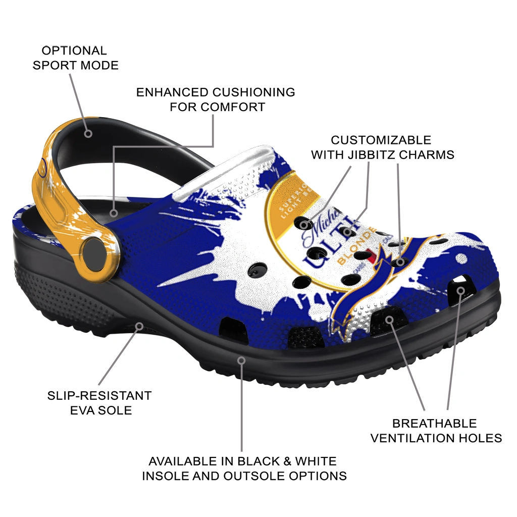 The Personalized Michelob Ultra Label Blue White Clogs from Hey Clogs slips on in seconds and keeps pace with your day – from slow mornings at home to city strolls and weekend getaways. Thoughtful design meets playful style with cheerful colors and prints that pop, adding personality to every step while delivering easy, breezy comfort and lightweight support wherever you wander. Want a signature touch? Customize yours with a name or initials for a one-of-one pair.