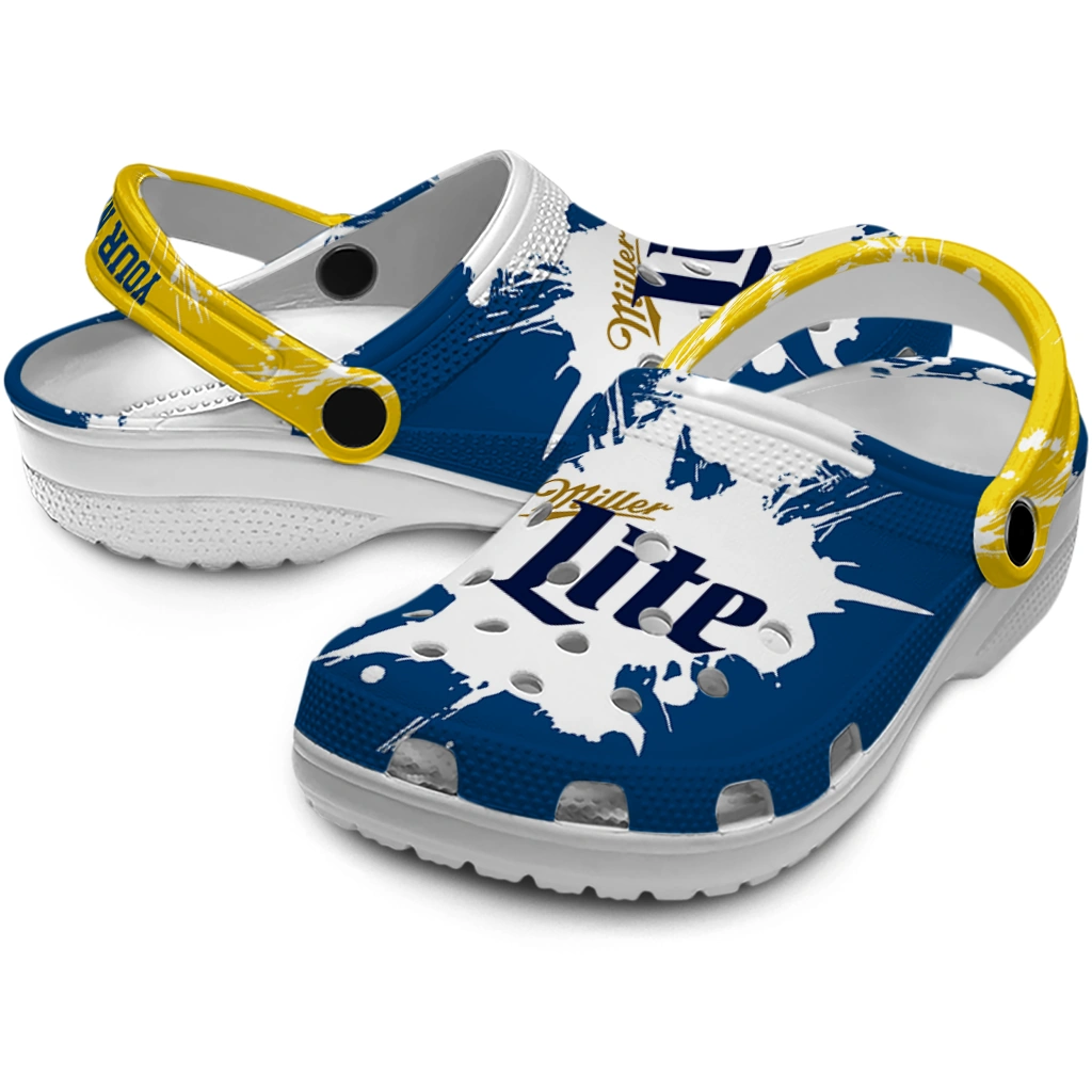 Personalized Miller Lite Splatter Accent Blue White Clogs