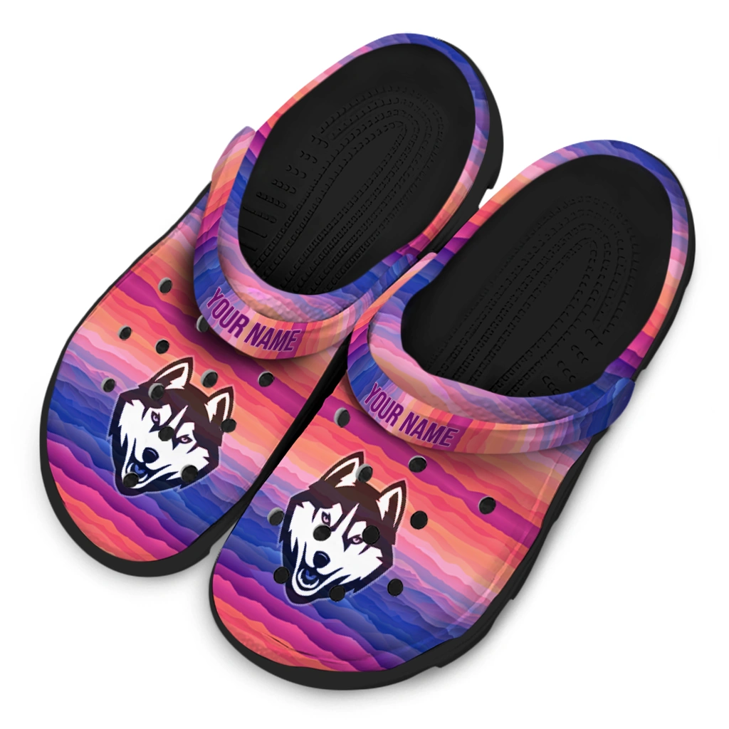 Your Clogs, Your Vibe, Your Name! Personalized UConn Huskies Wavy Stripes Clogs from Hey Clogs lets you take sport team-inspired style to a personal level! Featuring the bold colors you love, these featherlight clogs deliver unbeatable, all-day comfort. What a great way to make them truly yours: add your name to the heel strap! Perfect for gifting or treating yourself, these personalized clogs are a fun, spirited way to step out in comfort.