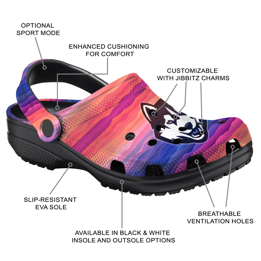 Your Clogs, Your Vibe, Your Name! Customized UConn Huskies Mountain Artwork Clogs from Hey Clogs lets you take sport team-inspired style to a personal level! Featuring the bold colors you love, these featherlight clogs deliver unbeatable, all-day comfort. What a great way to make them truly yours: add your name to the heel strap! Perfect for gifting or treating yourself, these personalized clogs are a fun, spirited way to step out in comfort.