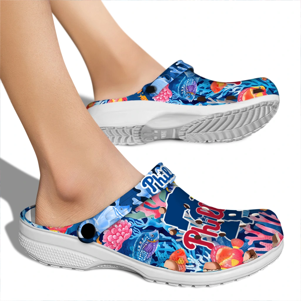 Your Clogs, Your Vibe, Your Name! Personalized Philadelphia Phillies Tropical Fish Ocean Clogs from Hey Clogs lets you take sport team-inspired style to a personal level! Featuring the bold colors you love, these featherlight clogs deliver unbeatable, all-day comfort. What a great way to make them truly yours: add your name to the heel strap! Perfect for gifting or treating yourself, these personalized clogs are a fun, spirited way to step out in comfort.