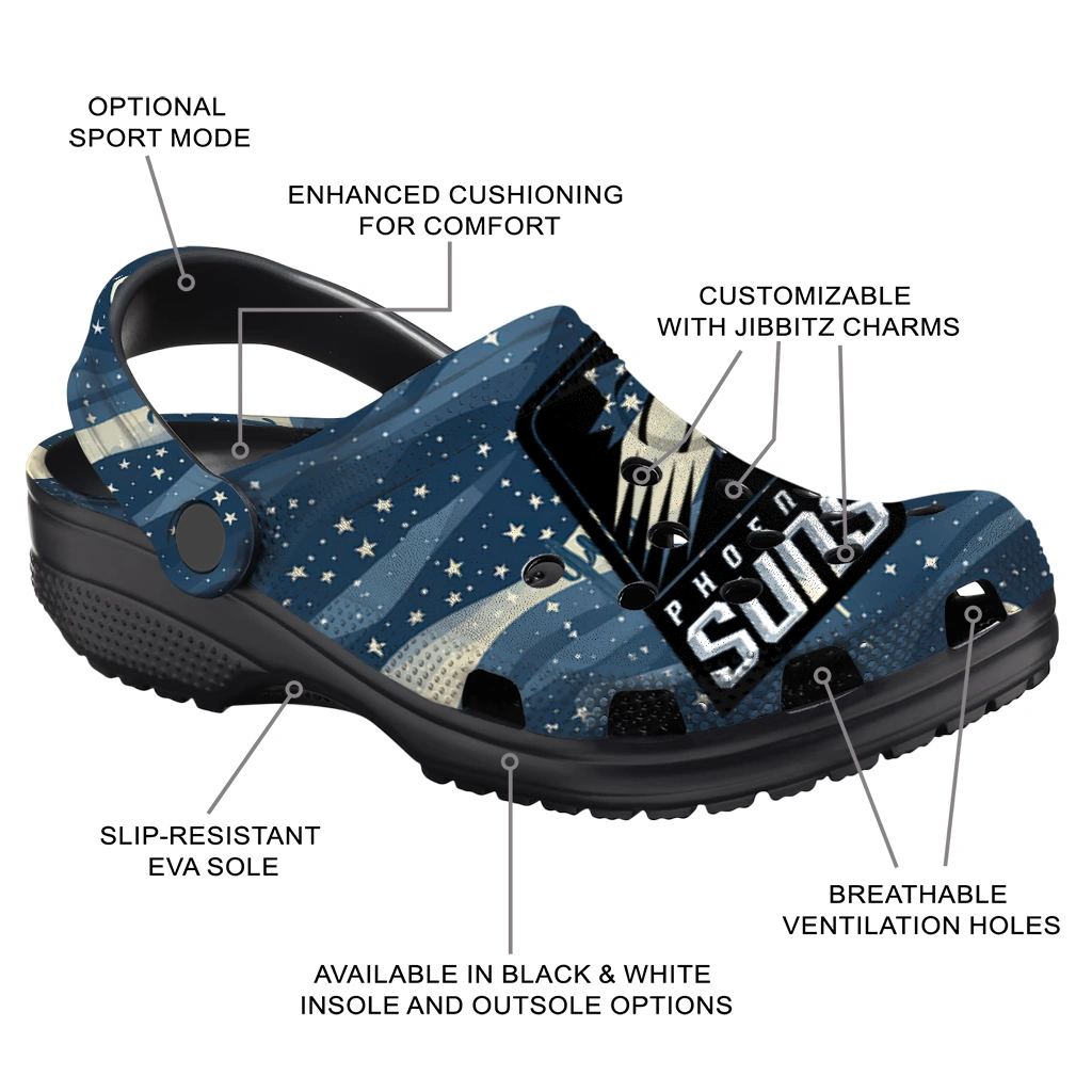 Your Clogs, Your Vibe, Your Name! Custom Phoenix Suns Deer Nightscape Clogs from Hey Clogs lets you take sport team-inspired style to a personal level! Featuring the bold colors you love, these featherlight clogs deliver unbeatable, all-day comfort. What a great way to make them truly yours: add your name to the heel strap! Perfect for gifting or treating yourself, these personalized clogs are a fun, spirited way to step out in comfort.