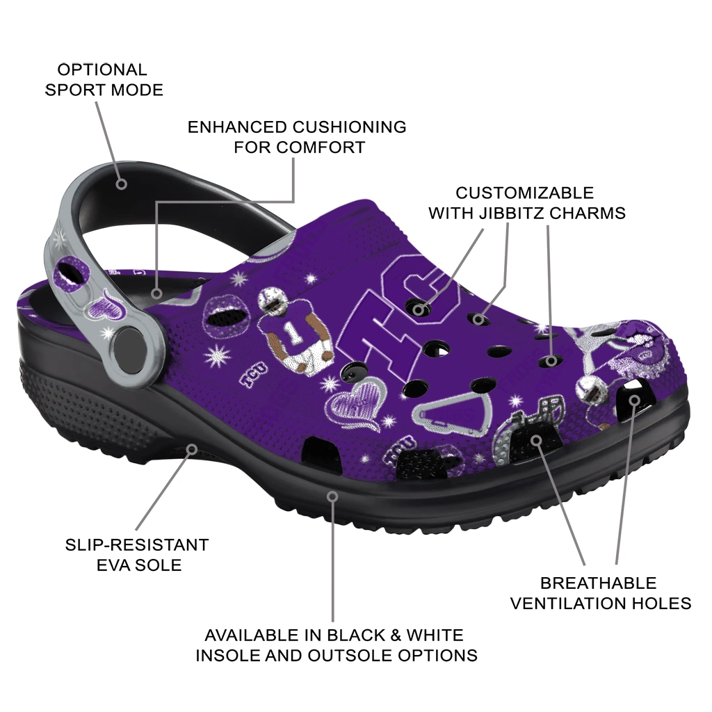 Comfort that Wins the Day! Can footwear truly be this comfortable and cool? Yes, they can! The All-Star Spirit Comfort Clogs – TCU Horned Frogs Football Icons Clogs deliver the cushiony feel your feet crave. Crafted from premium, durable EVA, they offer excellent support and shock absorption – perfect for those long days on your feet.